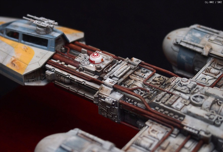 녹슨 파이프의 표현은 에나멜 레드브라운에 적갈색 피그먼트를 잔뜩 섞어서 걸쭉~ 하게 만들어서 도색한후에 건조되기 전에 환동 브러쉬로 두드려서 울퉁불퉁 질감을 만들었습니다. 군데군데 타미야 웨더링 파우더도 잔뜩 문질러 줬구요. Y-wing은 전체적인 색감 맞추는것 외에는 유화물감을 거의 사용하지 않고 대부분 에나멜로 도색 했습니다.