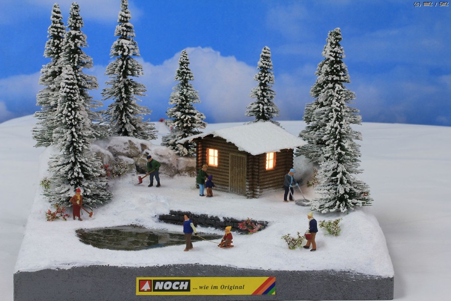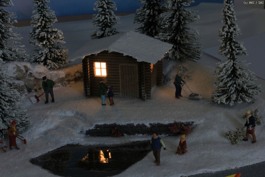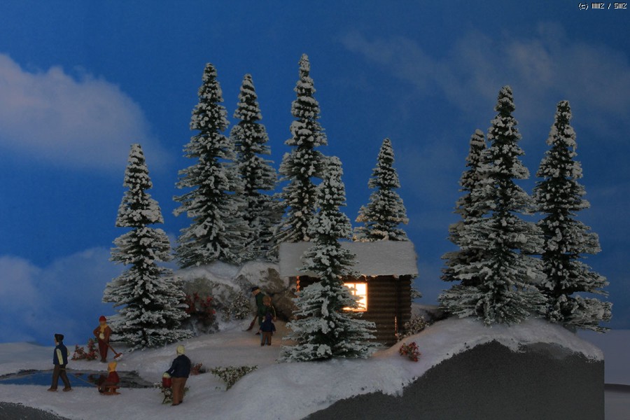너크 베이스로 겨울 디오라마를 제작하였습니다. 눈이 쌓인 겨울 산장과 사람들의모습 입니다.