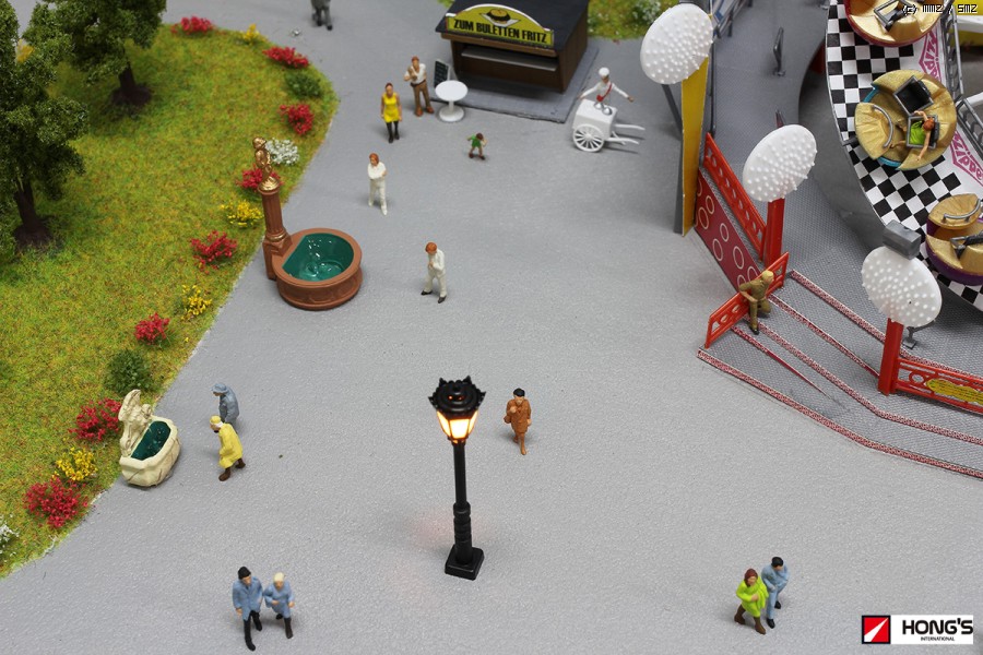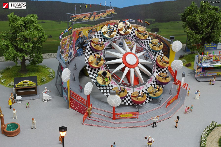 젤스톤 및 아크릴 물감으로 콩크리트 바닥을 표현 후 잔디지대 및 놀이동산 기구들을 올려주었습니다. 참고로 젤스톤을 물에 섞어 바르면 입자의 굴기가 고운 표면을 만들수 있습니다. 놀이기구들은 전용 조종기에 연결하면 모두 작동을 합니다.
