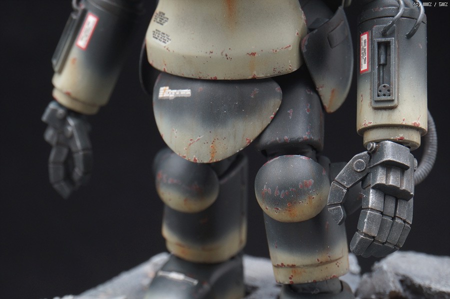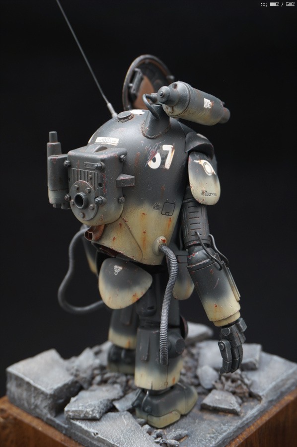 오른쪽 어깨쪽에 달린 무기(?)의 케이블, 뒤쪽 구조물의 약간의 용접선,