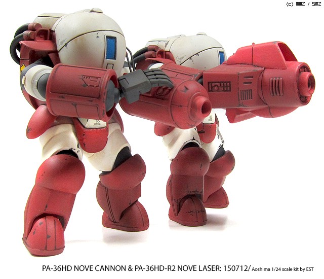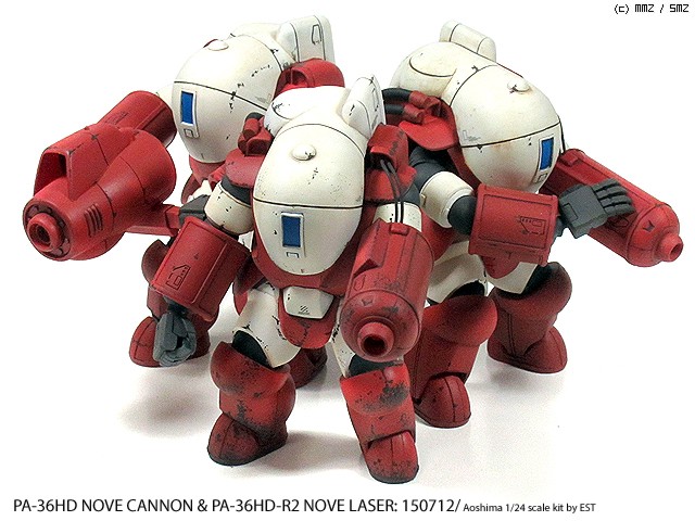 안녕하세요. 오래전 애니메이션 작품인 [특장기병 돌박]에 등장하는 파워드 아머(이하 PA) '노브'입니다. 작년 하비페어때 한번 들고 나갔었고 다시 손을 좀 봐서 올해도 들고 나갔습니다만, 사진찍고 편집하고 하면서 좀 많이 미뤄뒀던 통에 이제사 올리게 되었습니다. 다양한 노브 배리에이션 중 '노브 레이저' 2체와 '노브 캐논' 1체를 작업했습니다.