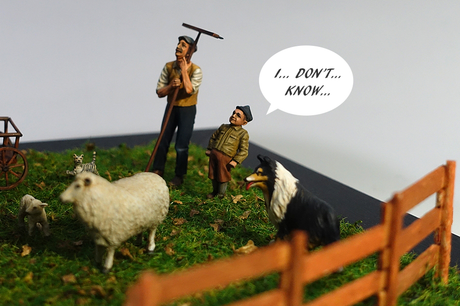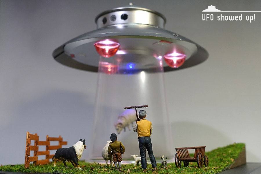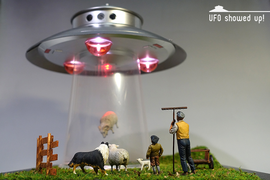 손과 머리의 아담스키형 비행접시와 1/35 인형과 동물들을 이용해 양 납치 장면을 연출했습니다.
