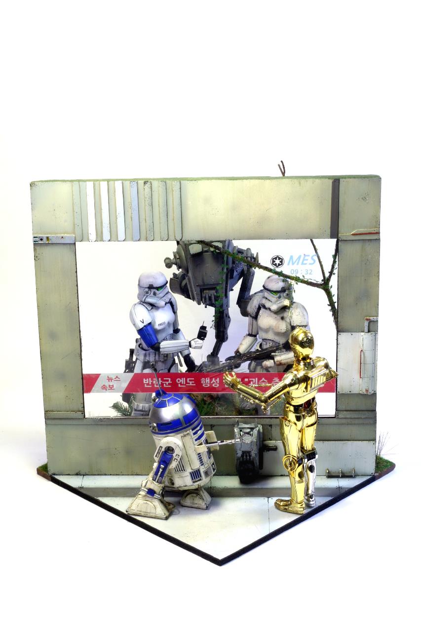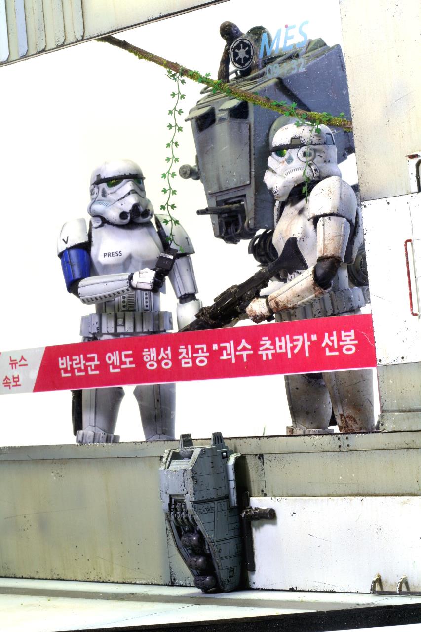 엔도행성을 침공한 반란군과 교전을 벌이는 제국군 스토미를 다른 스토미가 인터뷰하는 뉴스 화면인데요,이 뉴스를 또~ 알투와 쓰리피오가 티비에서 보는 액자구성 이에요~~