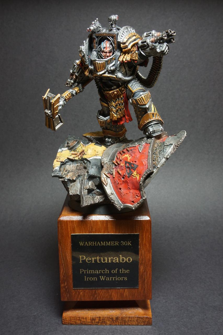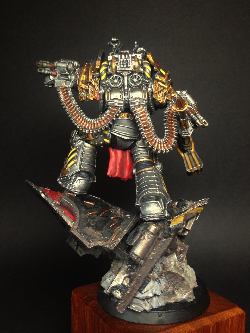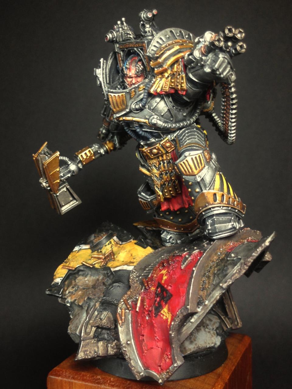 페투라보는 아이언 워리어즈(Iron Warriors)라는 스페이스마린 군단 지휘관(군단장쯤 된다고 보시면 됩니다)으로 반란에 가담했던 인물인데 웝서핑을 하다가 우연히 발견한 작품이 너무 인상적이어서 찾아서 구입하였습니다. 화려한 장식이 있는 구형 터미네이터 갑주, 합계 무려 8연장 기관총에 탄띠, 부서진 임페리얼 나이트를 딛고 서 있는 모습 등 매력이 한 가득이었고요. 저한테는 완성도를 떠나서 여러가지로 의미가 있는데 처음으로 만든 레진제품이며 베이스와 명판도 처음으로 만들어 보았고, 평소 비행기 만들때는 붓 한 자루로 다 처리했는데 얼굴 등 작은 디테일은 도저히 할 수가 없어서 세필을 처음으로 사용해보았습니다.