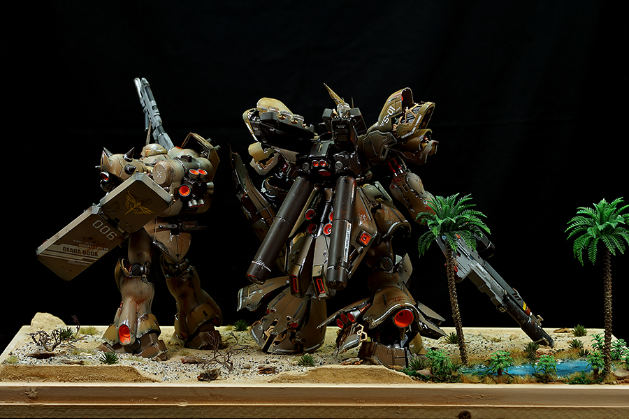 지난번 완성했던 [MG]사자비 버카 사막형 컬러 MSN-04 SAZABI Ver.Ka(Desert Color Custom) 와 [MG]기라도가 사막형 컬러 AMS-119 GEARA DOGA(Desert Color Custom) 두 킷을 이용해 원래 작업 계획했던 디오라마를 완성했습니다.