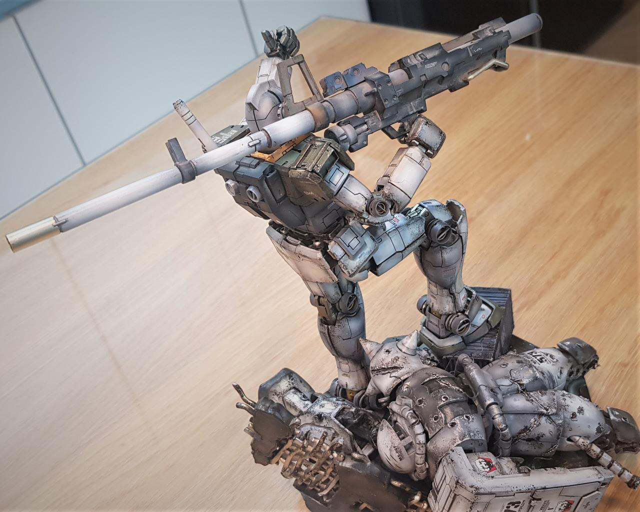 베이스는 반다이 MG용 액션베이스를 그대로 사용했고, 바닥에 깔린 격파된 자쿠2는 정크부품들을 모아 만들었습니다. 자쿠2에 하얀늑대라 불리는 신마츠나가 데칼을 붙여주었는데, 정작 자쿠머리에 지휘관 안테나를 깜빡 빼버렸습니다.