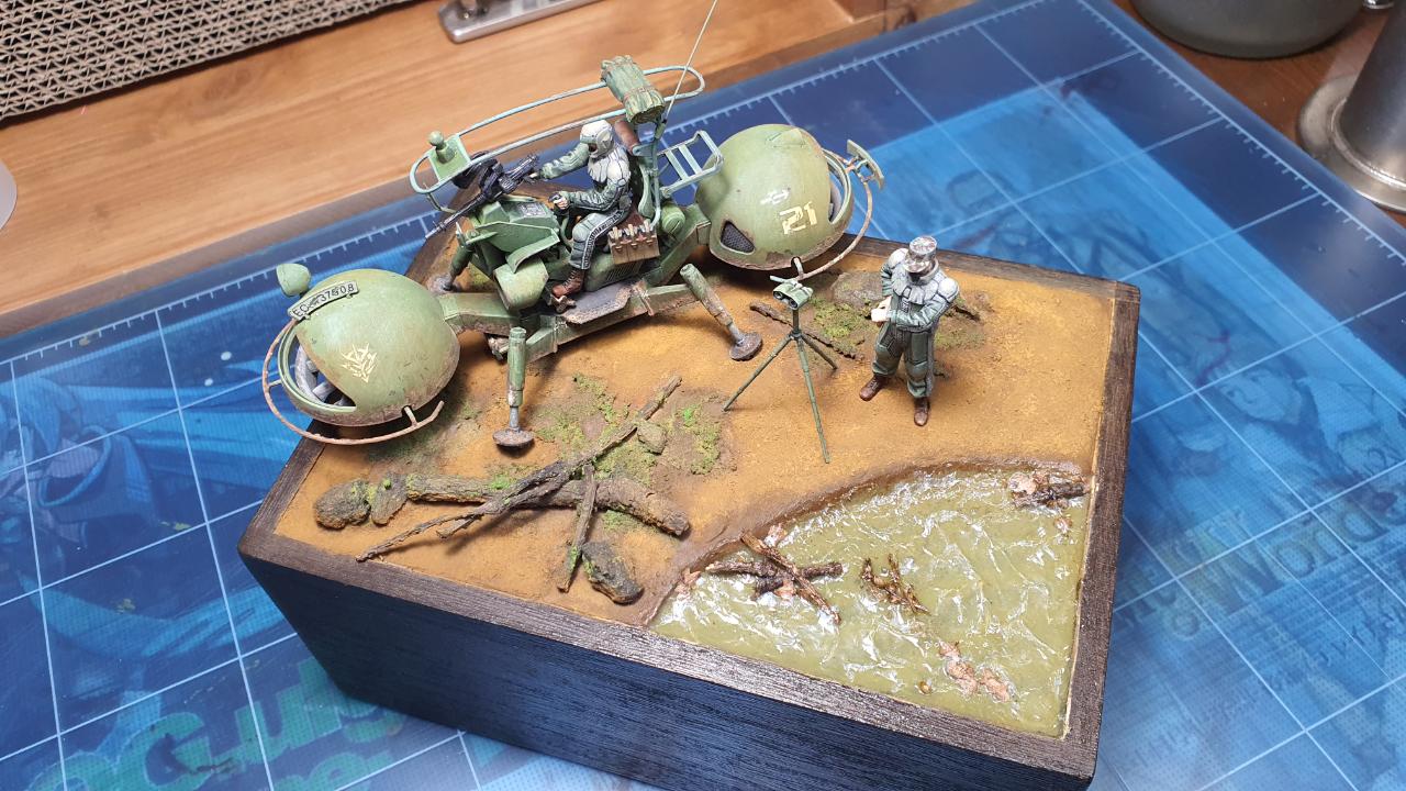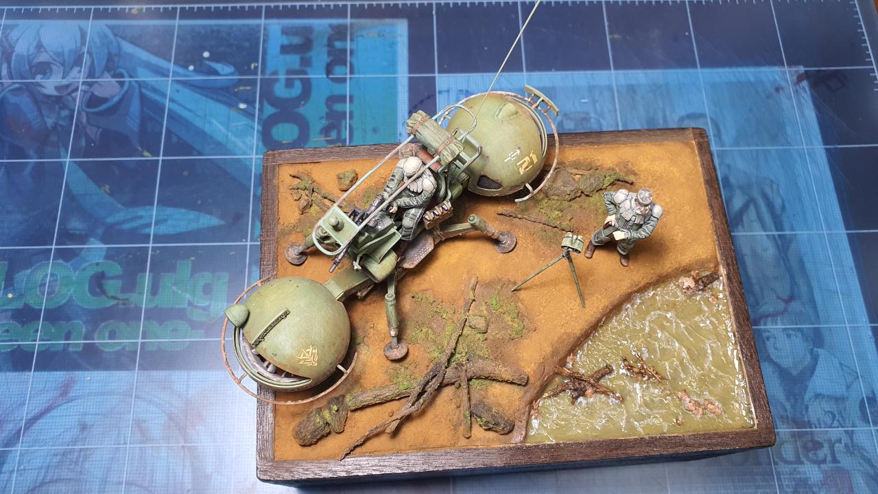 반다이사의 지온 모빌 스카우트 세트를,비슷하게 아크릴 도색만 했습니다.ㅎㅎㅎ 초보티 팍팍 나는 작은 디오라마 입니다. 바쁜 직장 생활 중에 틈틈히 만들었는데....인형 도색만 들어가면 힘이 쭉~ 빠지는 경향이 있네요. 베이스로 다이소 목제 수납함을 사용 했고,천사 점토와 톱밥,산에서 주워온 나무등등을 사용 했습니다.