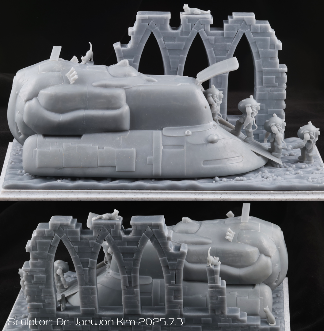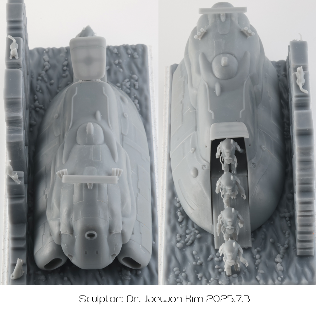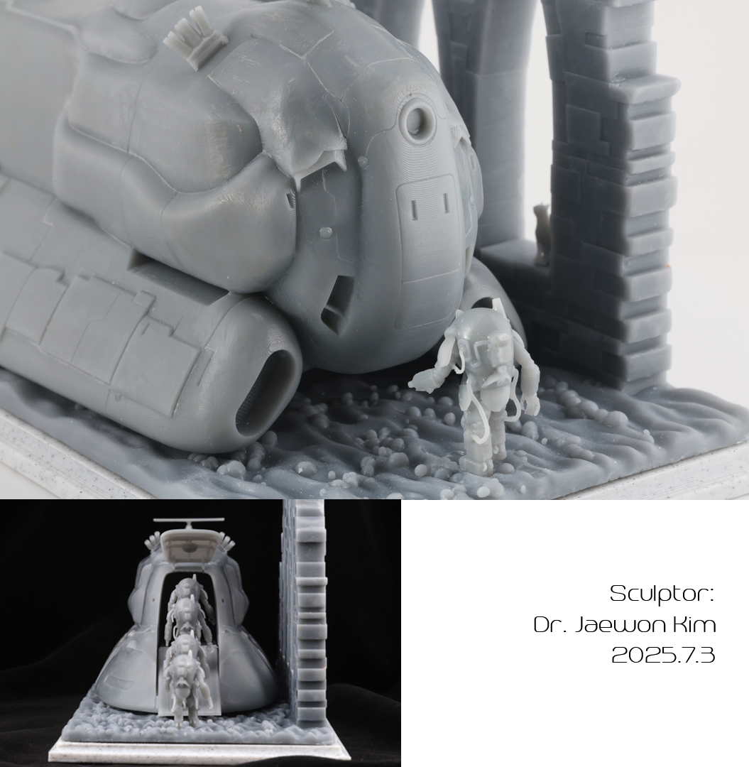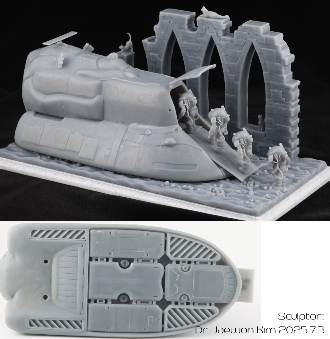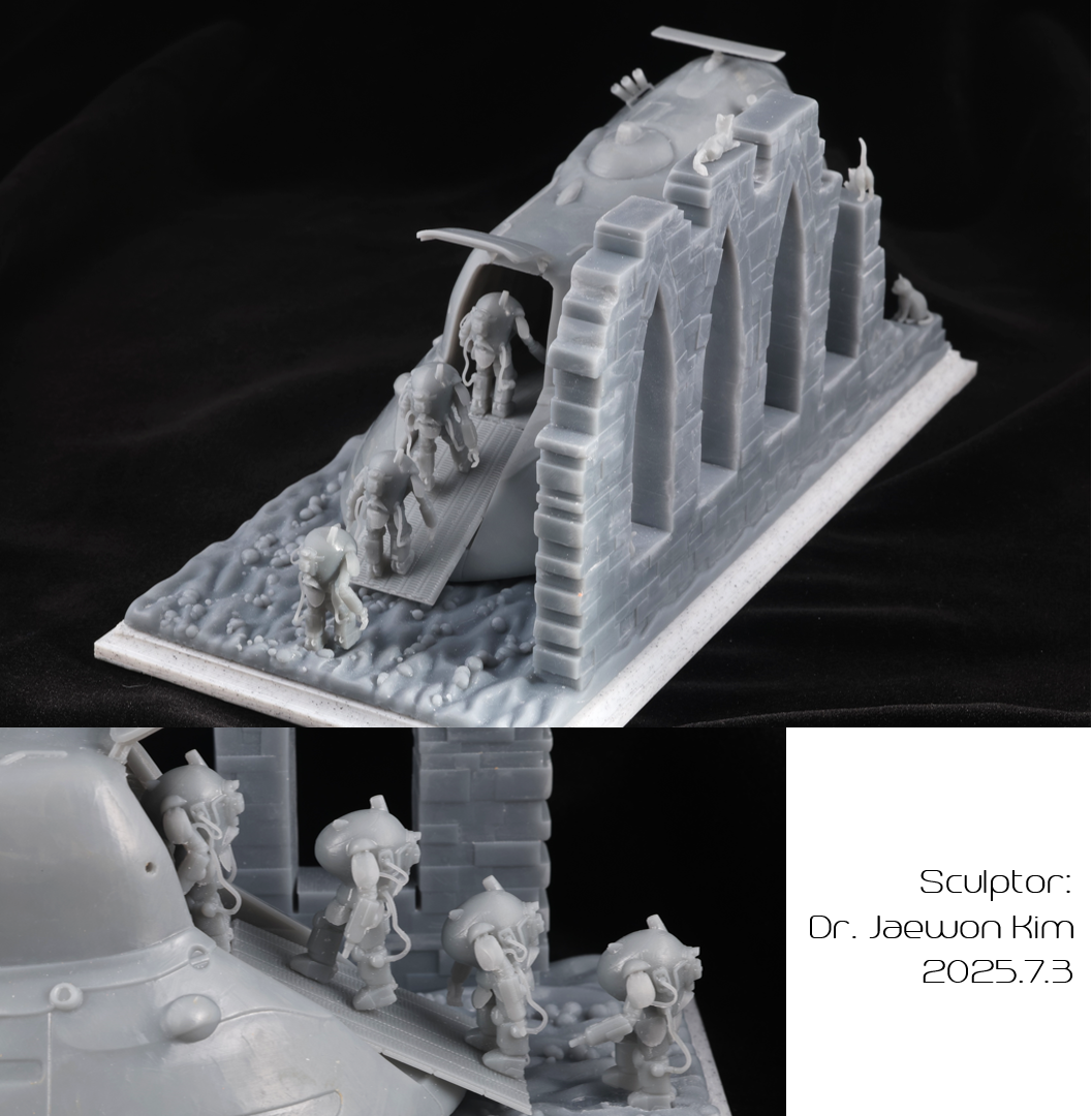SAFS 는 이전에 팔케 2 만들때 썼던 STL 파일을 포즈를 손봐서 네분을 만들어주었습니다. 크기가 약 2.5CM으로 엄청 작다보니 서포트를 떼어내는게 일이였는데, 울트라소닉 나이프를 쓰니 정말 뚝뚝 잘떨어지더군요. 물론 조심하지 않으면 모형표면에도 손상이 갑니다만 편하게 작업했습니다. 디오라마 베이스의 발자국은 Boolean difference 로 여러개 만들어 주었습니다.
