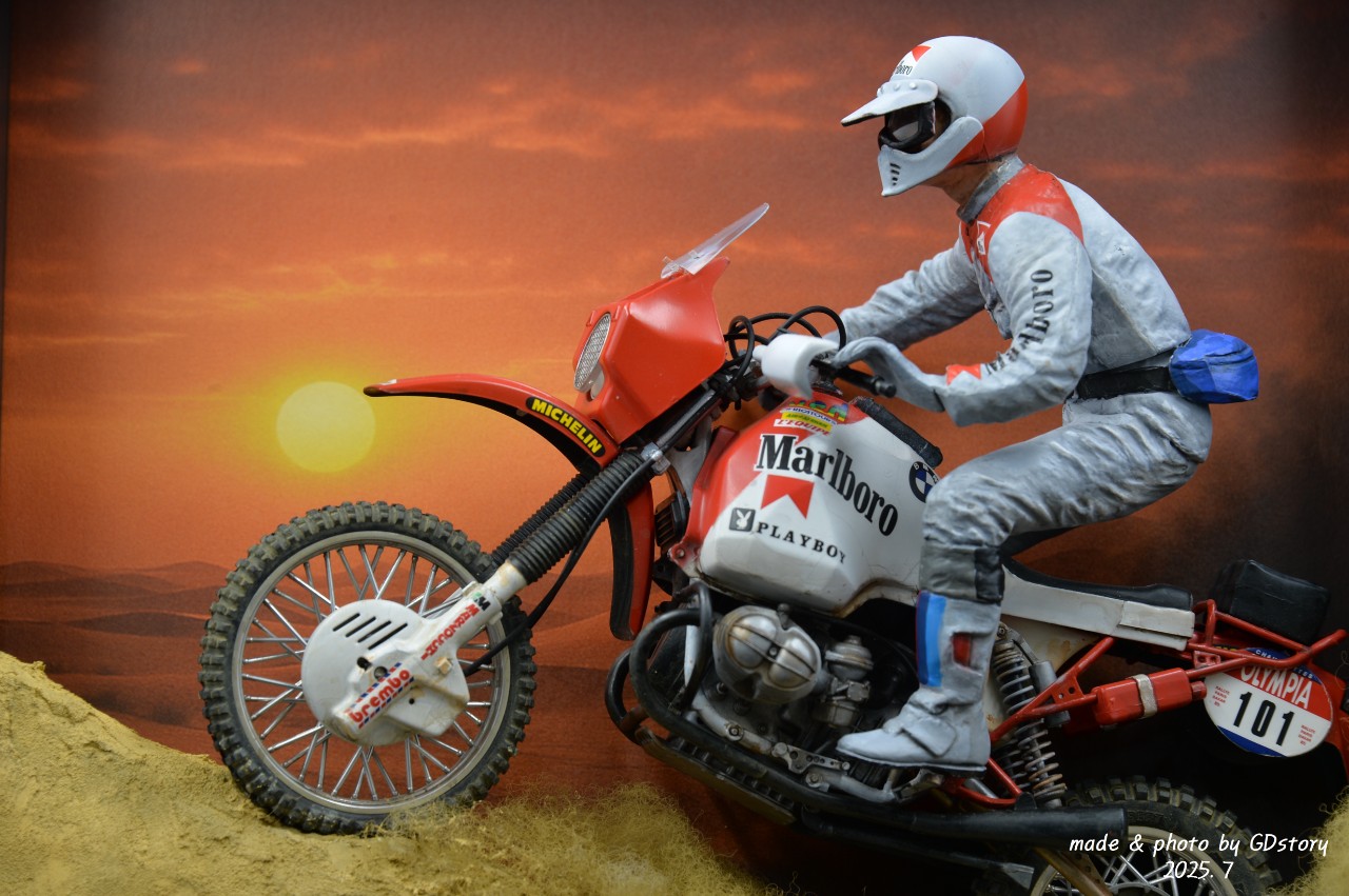 이 BMW R80 G/S는 오늘날 GS 어드벤처 바이크 계보의 원조로 불리며, 이 대회를 통해 그 역사를 남겼습니다. 이번 작업은 액자형 디오라마로 그 순간을 담아보았습니다.