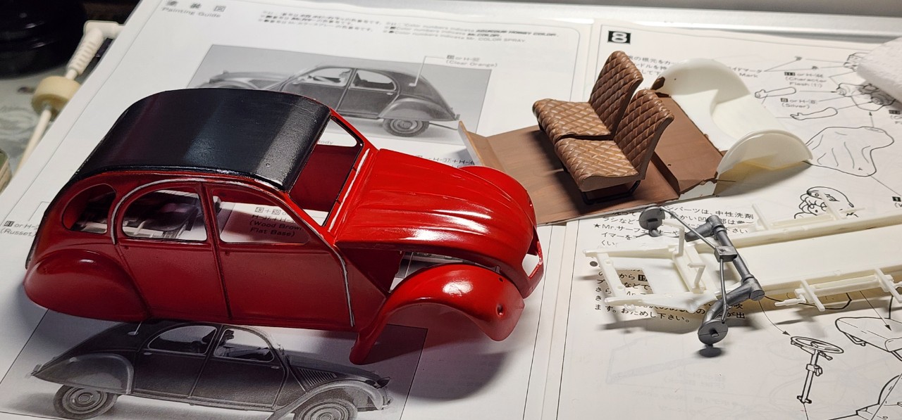 어렵사리 구했던 군제의 루팡 3세 칼리오스트로의 성 시리즈 중 하나인 클라리스가 들어있는 시트로엥 2CV를 만들었습니다. 평가에서도 상당히 조립과 완성이 까다로운데 디테일은 다이캐스트보다 못하다고 하니 클라리스와 애니속 묘사된 본넷을 재현하기 위한 레진 부품들, 데칼은 타미야 1/24 시트로엥 2CV에 적용하는게 좋다는 생각이 들어 제작하게 되었습니다... 만 전혀 만만하게 볼 키트가 아니여서 고생을 심하게 했습니다. 작례 사진을 보면서 고생길을 보았어야 했는데 바퀴 축이 뒤틀려 있는지 저렇게 한쪽 바퀴가 안닿는것은 예삿일이고 본넷은 한쪽만 맞고 한쪽이 안맞으며(...) 가장 큰건 전면 유리창이 제대로 끼워지질 않아서 순접 범벅이 되어버려 그냥 1천방 사포로 밀어버리고 6천방, 8천방으로 갈아내고 별짓을 다 했습니다.