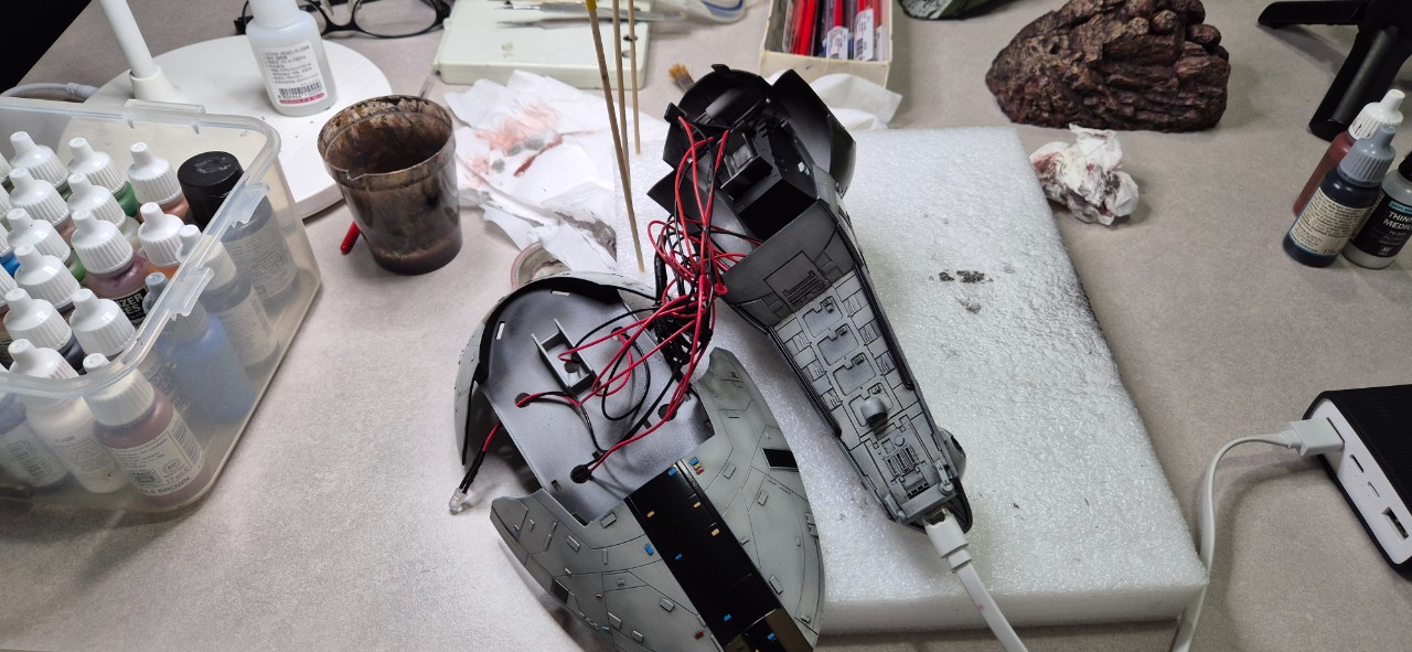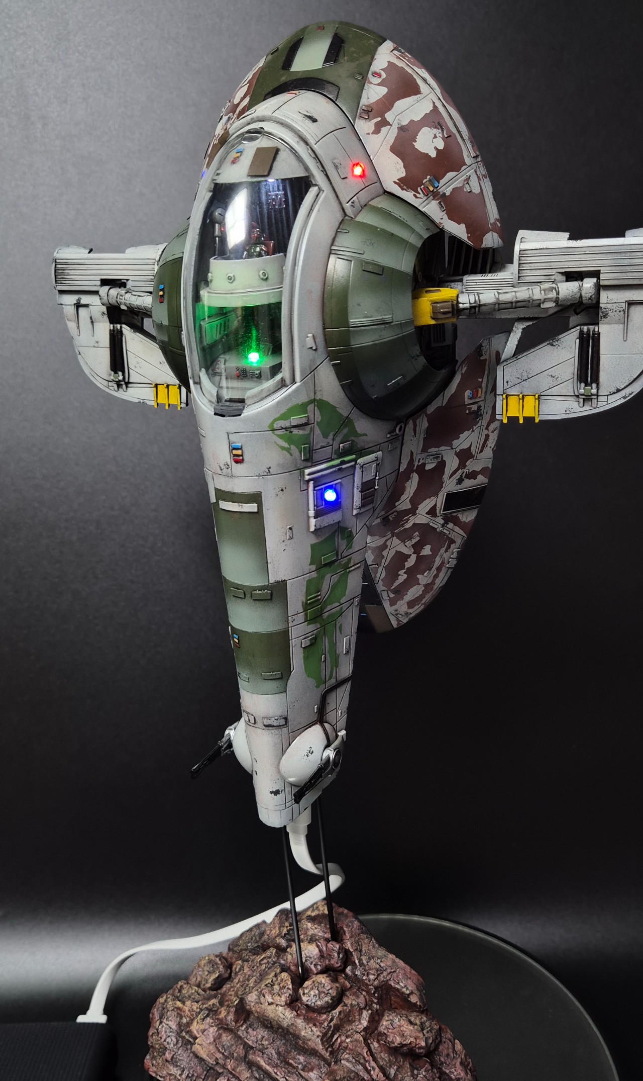베이스는 석고몰드를 이용해 뽑아내고 도색했습니다. 기체 하단에 usb 커넥터를 설치해 밧데리로 전원을 공급합니다.