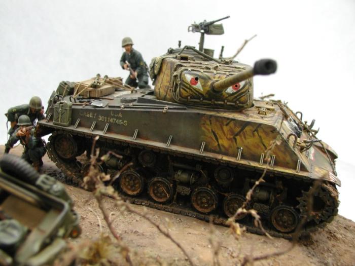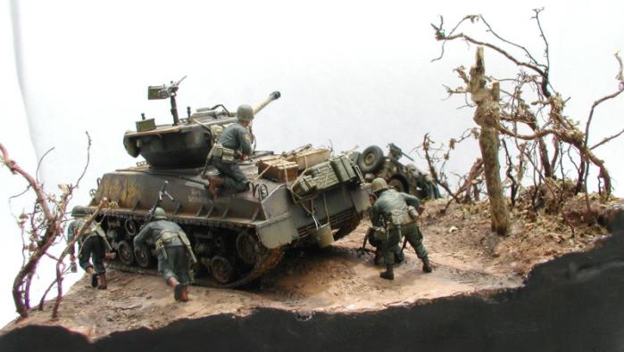전차를 따라 엄폐하며 위치를 향해 뛰어가는 병사를 표현