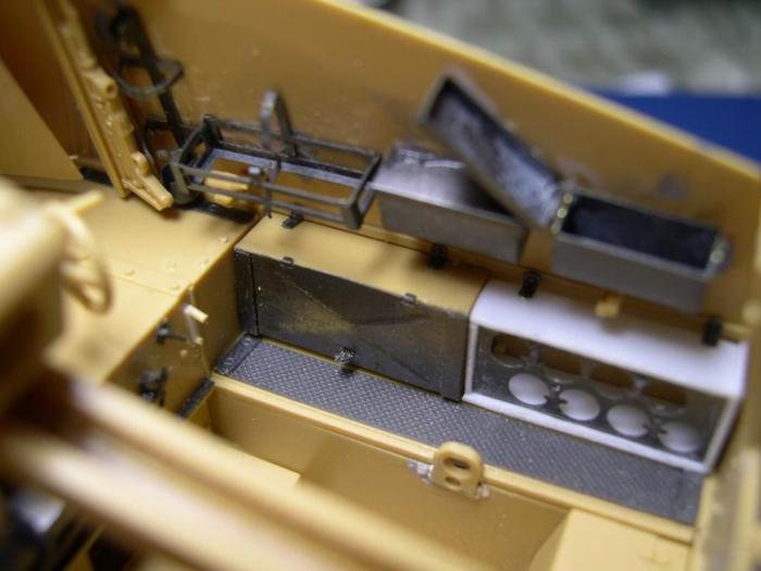 차체 내부 정말 힘든 포탄 랙 프라판으로 만들었는데 치수가 맡지 않아서 큰 고통이었습니다. 포탄 케이스 문짝은 자료집을 보면 저런게 생긴 없는 줄 알았는데 jardtiger 싸이트 가보니 저런것도 있더군요. 어느쪽으로 열리는지 몰라서 뒤에 녀석은 문짝을 엎에 버렸습니다.