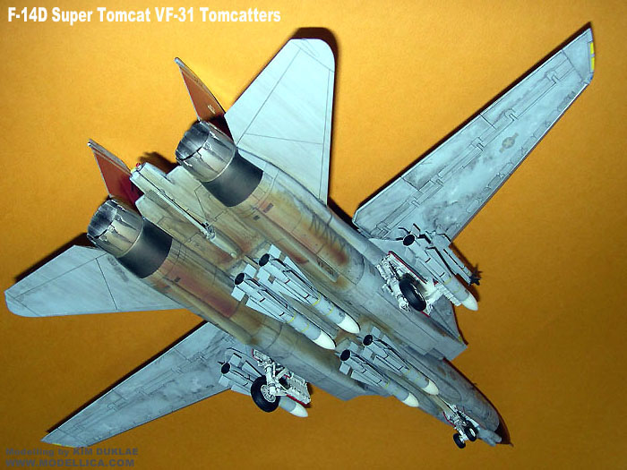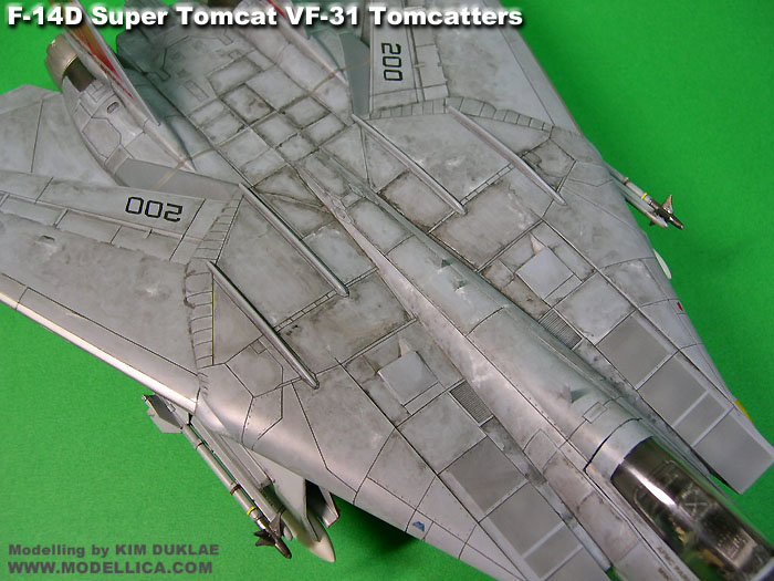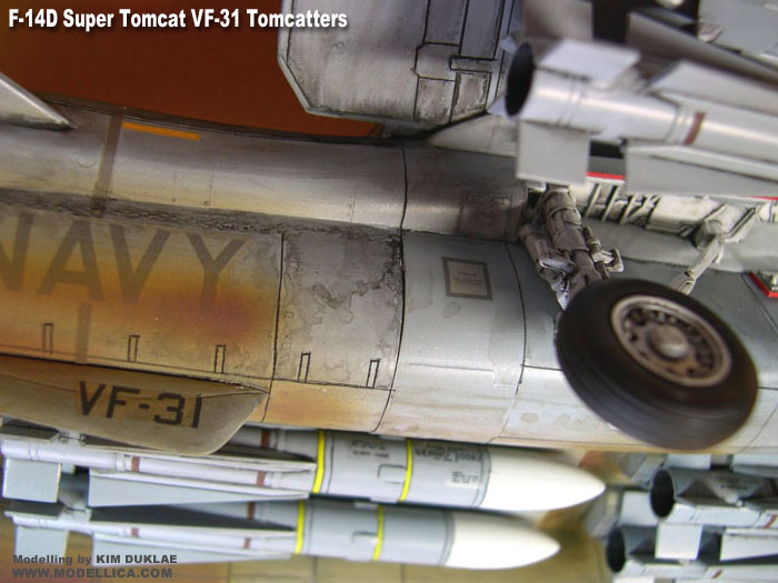 레벨의 1/48스케일의 F-14 D형의 슈퍼 톰캣입니다. 품질은 데칼이 상당히 불만스러운 키트지만 그대로 사용을 한 것입니다. 그리고 가장 문제가 심각했던 수직 꼬리 날개에 붙는 팰릭스의 마킹은 팰릭스 캐릭터를 레인펜으로 수정을 해주었습니다. 실기 사진을 토대로 웨더링에 중점을 두었습니다. 키트 그대로의 부품을 사용하였고 피닉스 미사일만 아카데미의 키트에서 여섯 발 모두를 사용한 것입니다.