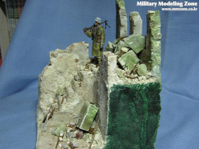 베이스는 스티로폼을 기본으로 계단을 잘라서 붙이고 석고를 한겹 입힌 다음 뒤 배경이 되는 건물은 우드락에 대충 건물모양을 정하고 테두리와 창문부분을 우드락을 잘라 붙이고 물게 갠 석고를 부어서 굳힌 뒤에 약간 덜 굳었을때 건물 모양을 새겨주고 파괴된 모습을