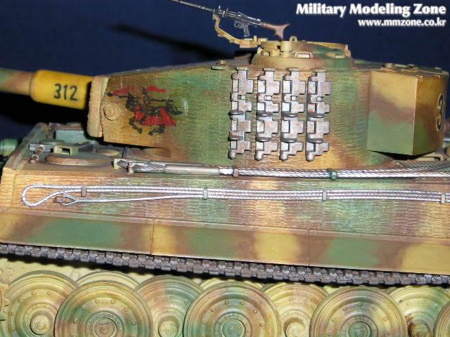 전차는 505중대 312호 차량입니다 505중대는 화려한 달리는 기사 마킹으로 알려져있습니다. 더불어 파격적으로 독일군 마크가 생략 되어있고, 측면 차량 번호도 포신쪽에 작게 한족면에만 표시가 되어있습니다.