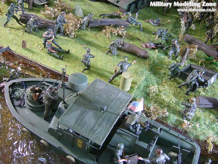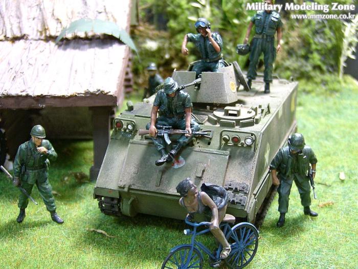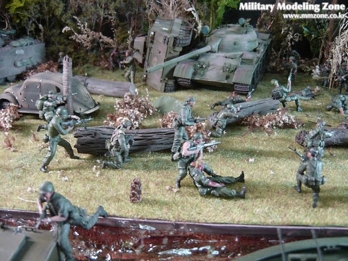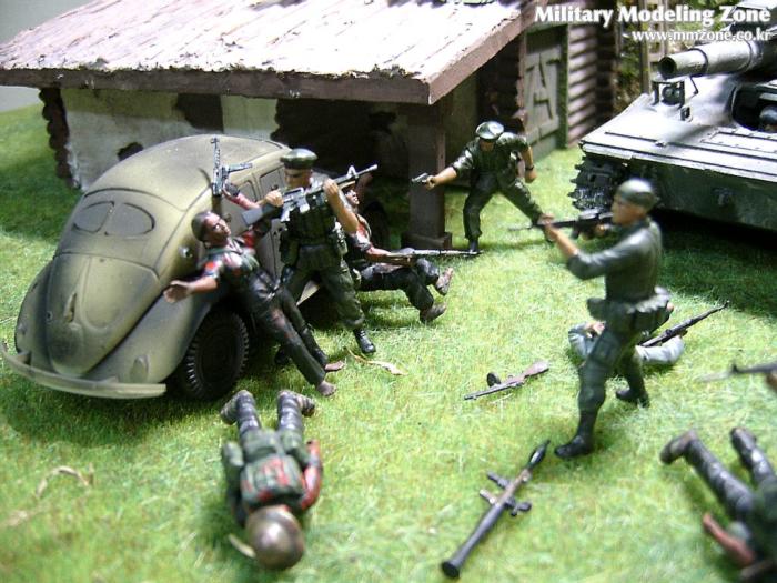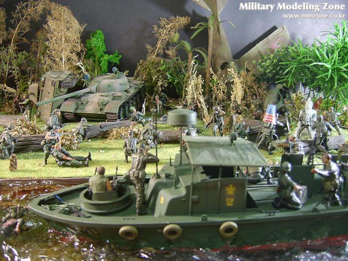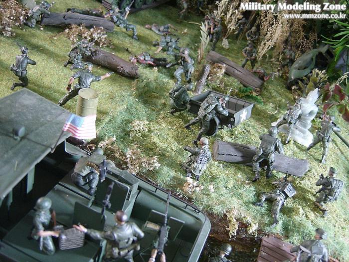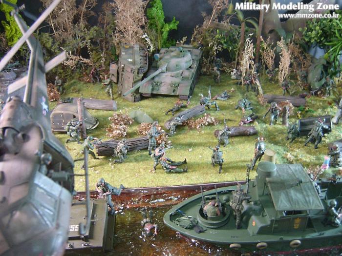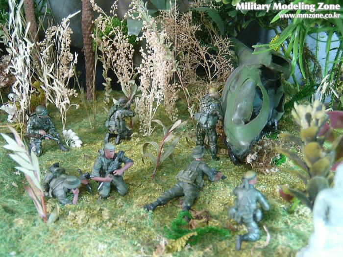 아마 이번 작품은 제 유작이 될 뻔했습니다. 사회일에, 미국으로 가려는 준비(한달 뒤 떠납니다)그리고 새벽마다 새벽잠을 쪼개는 작업, 결국 입원했고 푹 쉬어야 산다고해서 2주간 병원침대에 누워 있었습니다(한주는 제 휴가 기간이었는데 병상에서--). 하긴 지난 몇년간 모형에 너무나 많은 시간과 노력을 바쳐 왔던게 사실입니다. 사실 이번 월남전 플랜도 처음에는 -과거에 대규모 물량투입을 못 마땅하게 보시는 분들이 많아서- 정말 멋있게 인형10개 정도만 만들고 소규모 디오라마를 만들 예정이었습니다. 그런데 이게 욕심에 욕심을 물어 결국 사고싶은 물량을 다 구입하고 150개가 넘는 인형과 적지 않은 도구들을 만들게 되었습니다. 또 이번 제작을 위해서 현지에도 가보고 많은 사람들과 이야기를 나누웠습니다. 월남 파병자료나 파병되셨던 분들과 이야기를 많이 나누고 자료도 많이 찾아 보았습니다. 월남전은 심지어는 M8 까지 굴러 다닐정도로 무기체제에 혼합이 이루어졌던 전쟁입니다. 이번에도 괜히 크게 만드는거 아냐 하는 자책이 들면서도 한편으로는 아무도 안 만드니 나라도 한번 만들어 보자는 욕심이 들었습니다. 한편 대테러 디오라마와 영국군 정찰 디오라마-이미 전차와 인형25개 정도 완성-을 동시에 병행하니, 정말 병 날만 하더군요. 그래도 회복되자 마자 사진찍는 것을 보니 정말 미치긴 미쳤나 봅니다. 다만 이번에는 베이스의 세로가 길어서 손을 올릴 자리가 없어서 사진이 마음에 들지 않다는 점이 있지만 그래도