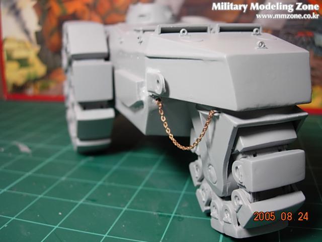 쇠사슬 부분은 따로 샀습니다. 몸통 쪽은 구멍을 뚫어 본드로 고정 시켰으며 바퀴쪽은 쇠사슬을 불로 벌겋게 달구어 억지로 끼워 맞추었습니다.