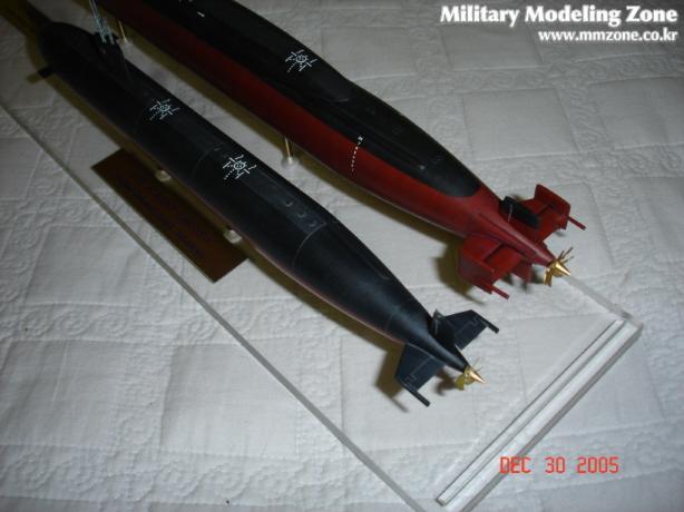 실제 잠수함 도장을 확인하기 위해 인터넷을 뒤졌는데 오하이오급의 도장은 진수시의 도장패턴과 나중에 도크에서 찍힌 도장패턴(상부의 검정색이 선체 중반까지 칠해집니다)이 다르더군요. 제 모델은 진수시의 도장을 재현했습니다. 로스엔젤레스급은 선체마다 도장이 조금씩 다르더군요. 선수부분이 검게 칠해진 것도 있고 아닌것도 있습니다.