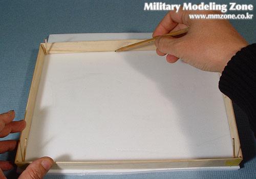 테두리 목재 내면에 목공용본드를 바르고 우드락을 끼웁니다.