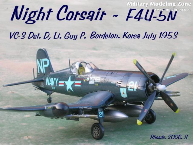 이번에 만든 모형은 미 해군 제 3 혼성비행대 D분견대(VC-3 Det.D) 소속의 가이. P. 보델론 대위(Lt. Guy P. Bordelon,Jr.) 가 탑승한 F4U-5 N, BuNo. 124453입니다. 보델론 대위는 당초 CV-37, 항모 프린스톤 소속으로 한국전쟁에 참전했습니다만 전쟁이 막바지로 치닫던 1953년 6월, 제 5 공군의 요청으로 서울 근교 김포 비행장에 분견대로서 진출해 "Bedcheck Charlie" 란 별병으로 야간에 내습하는 북괴군 항공기의 요격 임무에 투입되게 됩니다.