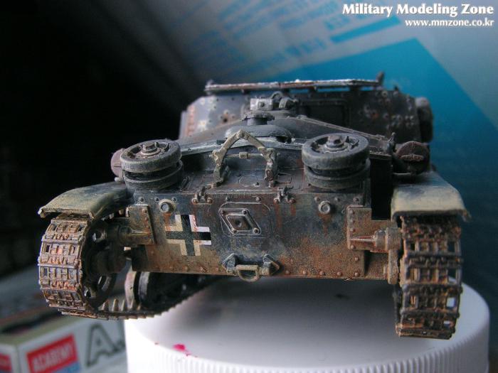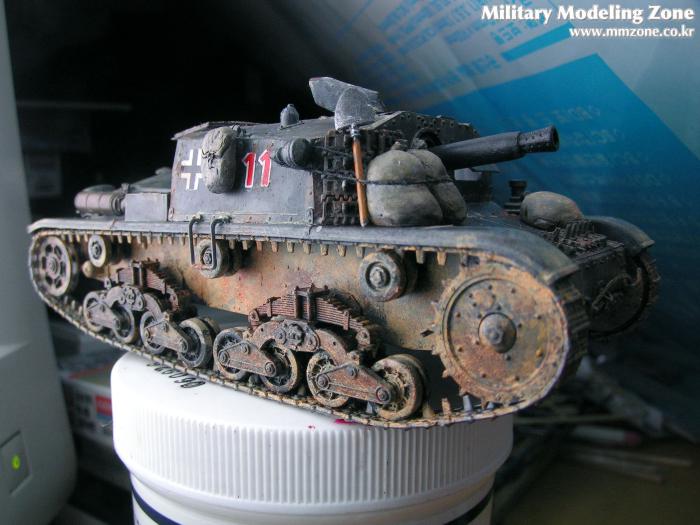 이 탱크는 원래 이탈리아꺼라는데 독일군이 빼았은 형태의 도장을 해줬습니다. 고증은 사실 전혀 모르구요, 그냥 팬저그레이 비슷하게 칠하고 십자가를 넣어주면 독일군처럼 보이지 않을까 싶어서 그렇게 했습니다. 그런데 안에 타고 있는 운전병은 키트 안에 들어있던 이탈리아 운전병이라서, "독일군에게 빼앗긴 전차를 다시 회수해 왔다"는 내용의 간단한 베이스를 만들어주려고 합니다.