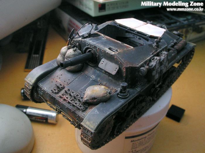 즈베즈다제 M40 75/18입니다. 미술용 아크릴로 기본도색 후에 사막색 에나멜로 틈새에 먼지가 낀 표현을 해줬고, 다시 미술용 아크릴과 모델링 페이스트 등으로 녹슨 부분이나 흙표현들을 해줬습니다. 이따가 집에가서 사막색 에나멜로 하이라이팅 해주고 파스텔로 먼지 표현을 좀더 해줄 생각입니다. 그리고 이렇게 보니 앞쪽에 붙인 캐터필러에 지느러미가 살아 있군요. 잘라줘야겠습니다. 차 위에 올라 앉은 저의 배를 닮은 통통하고 귀여운 사대(여자친구가 그렇다는군요.. ㅎㅎ)는 에폭시를 빚어 만든겁니다. 처음으로 에폭시 퍼티를 써봤는데, 무척 재밌습니다. ^^
