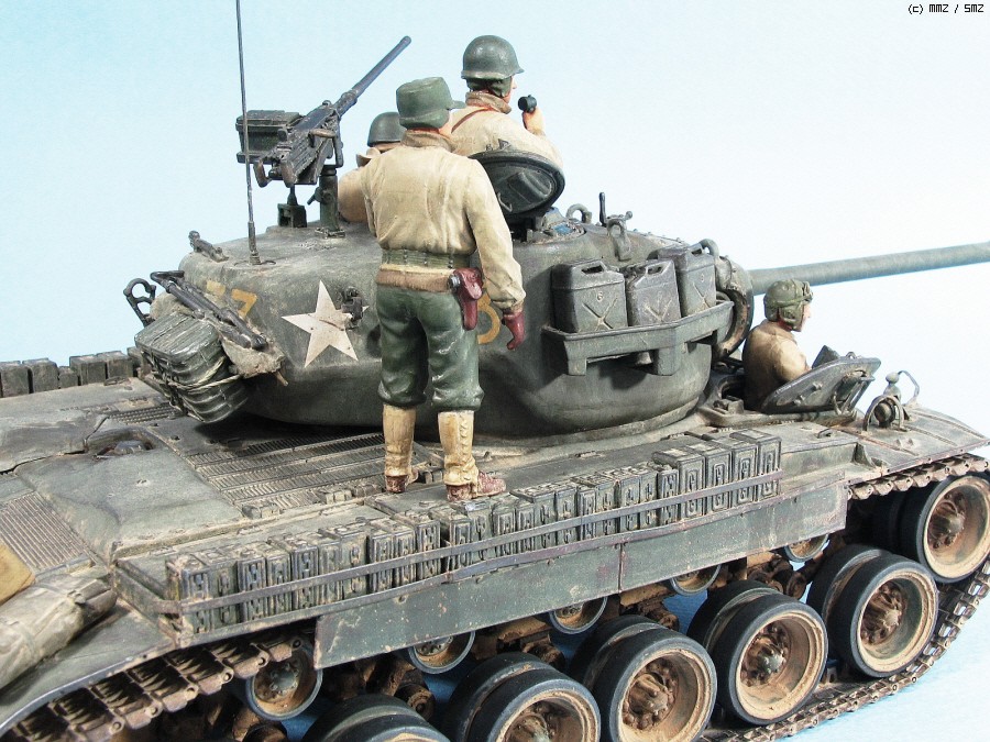 한국전 사양으로 만들었고, 6.25때 유일하게 전차 세대 잡고 "킬마크"를 단 미해병 소속으로 도색했습니다.. 드래곤의 연결식 궤도에는 가운데 핀에 구멍이 재현되어 있고 모양도 괜찮은 듯 합니다. 인형도 얼마전의 M45에서 출연했던 3명에 두마리 추가 했습니다..원래 M26 에 실으려 했으니 제짝을 만난 셈입니다... 역시나 인형은 더많은 노력을 해야 겠고...너무 어렵네요. 그리고 드래곤 M26A1과 차체 상판을 바꾸어 준 동호회 "조립식"의 안일섭 님께 이자리를 빌어 감사드립니다...