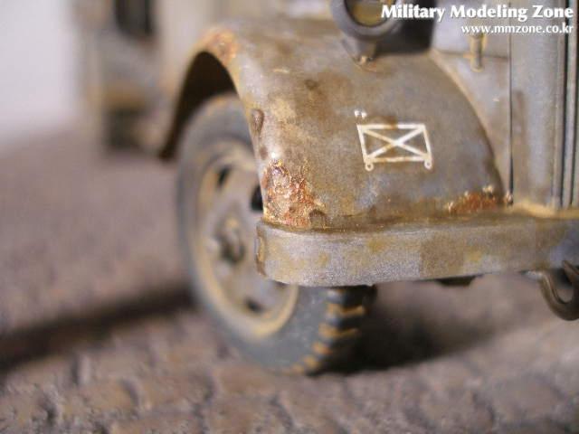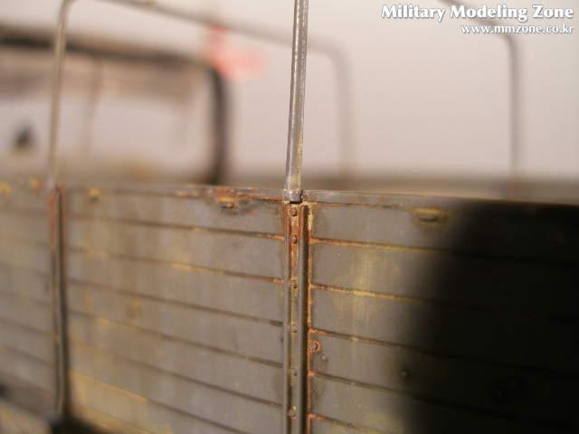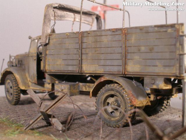 이탈레리 오펠브리츠 입니다. 킷에 있는 덮게 지지대를 쪼개서 하나하나 붙여주었습니다. 게획은 덮개를 씌우고 적재함과 사이에 묵는 끈도 표현 하려 하였으나 잘안되더군요! 할수없이 앞쪽으로 몰아 묶은 형식으로 마무리 햇습니다.
