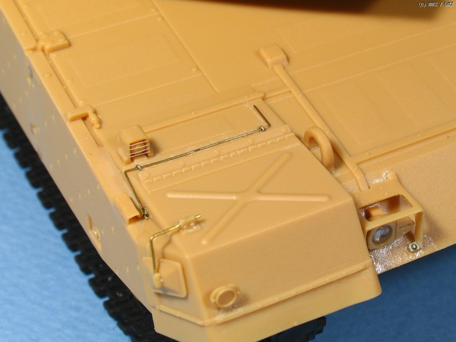 견인 와이어를 바꾸어 주고 에칭 조각 등으로 고리를 어색하지 않게 만들었고, 얇아야 할 것은 얇게 다듬고 흙받이 고무 처럼 잘 휘는 부분은 조금씩 휘어 주었습니다.