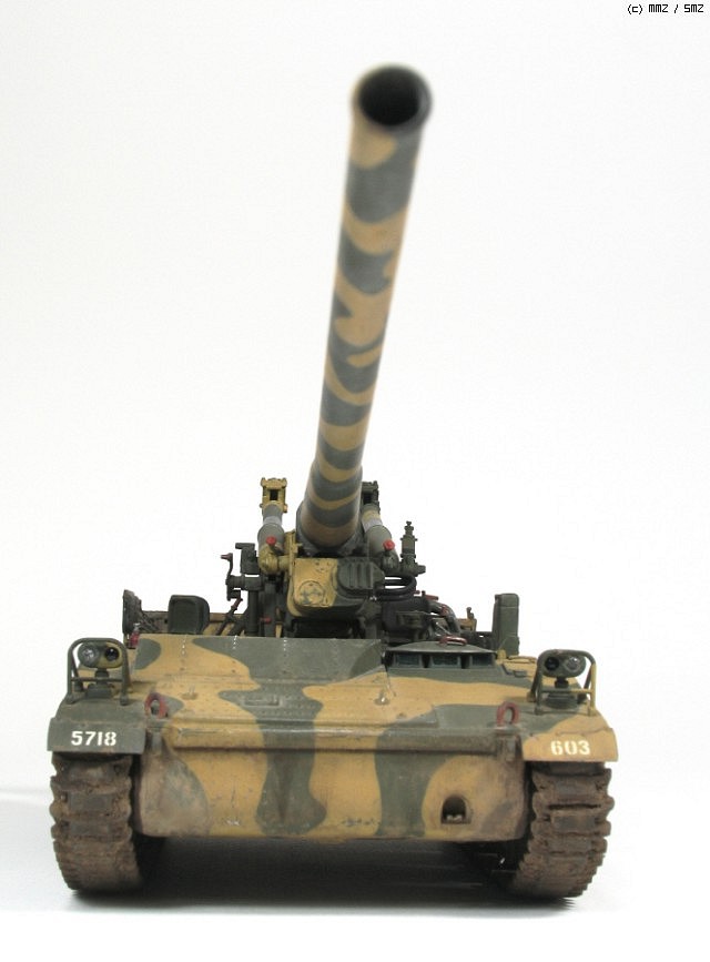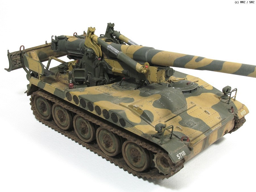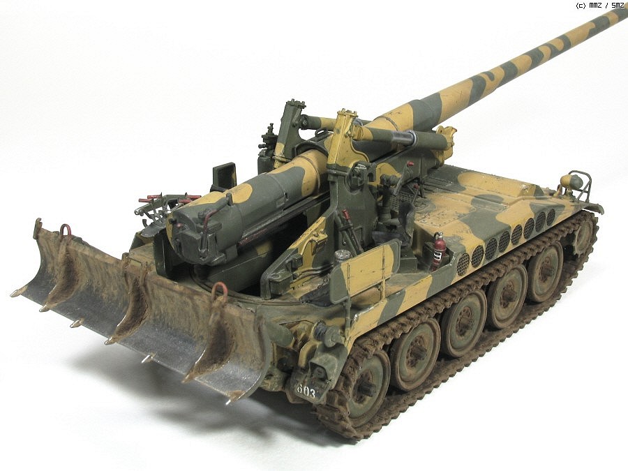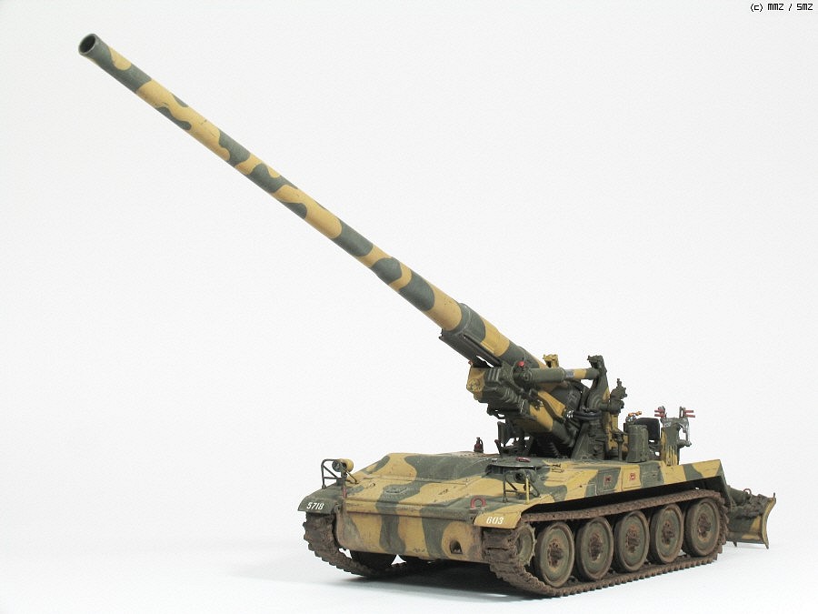육군이 사용했거나 전쟁 기념관에 전시된 M107을 보면 포신 고정구로 체인이 있어 차체 전방 고리에 연결되는데 여러가지 궁리를 해 보다가 포기하고 생략 했습니다. 그것 때문에 마무리가 오래 걸린 면도 있습니다.