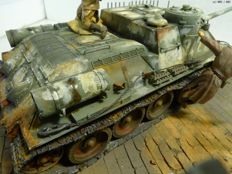 SU-85. 3년여전에 만든 놈을 꺼내다가 색칠을 다시 했습니다. 그동안 배운 표현도 적용해 보고... 동게위장 흰색 수성페인트를 벗겨낸 전차로 설정했습니다.. 자료를 보니 수성페인트라 물을 묻혀 천으로 쓱쓱 문질러 칠을 벗겨내기도 했다고 하는데... 설정은 조심스럽게 퇴각하는 장면을 생각하며 만들었습니다. 철길의 녹색은 피그먼트를 이용하고, 펜스는 프라봉으로 자작했습니다. 바닥은 석고를 만들고 철심으로 블록을 일일이 파서 표현했습니다.. 석고가 일부 부서지면서 자연스러운 파괴된 보도블럭이 되었네요.... 소 뒤걸음치다가 쥐잡는 것이 이런건가 봅니다...
