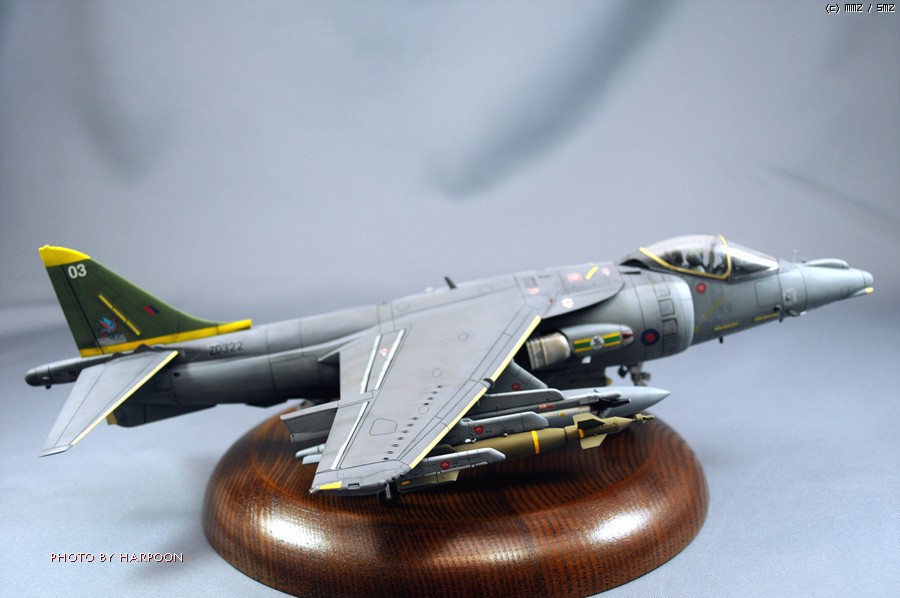 하세가와 HARRIER GR MK.7 1/48 입니다. 벌크성 기체를 구입해서 제작을 했습니다. 손실된 부붐이 많아서 고생을 했습니다. 도색은 설명서 지정된 색으로 했습니다. 웨더링은 상면은 깔끔하게 하면 특히 후방노즐부분에 아주 더럽게 했습니다. 데칼이 좀 문제가 있었습니다. 갈라짐도 심했고 마크세터에 너무 잘 반응하는 바람에 녹아 버린것도 좀 있어서 고민을 많이 했습니다. 고양시 일산 서구에 사시는 모델러 백모님 덕분에 마무리가 가능하게 되었습니다.