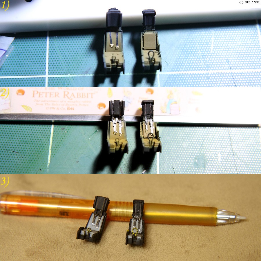 사출좌석은 사진처럼 썰렁하기 그지않습니다. 그래서 왼쪽과 같이 은색 라인테이프(폭 0.5mm)를 사용해서 벨트를 표현하고, 가지고 있는 가장 얇은 황동선을 이용해서 버클을 표현해 주었습니다.