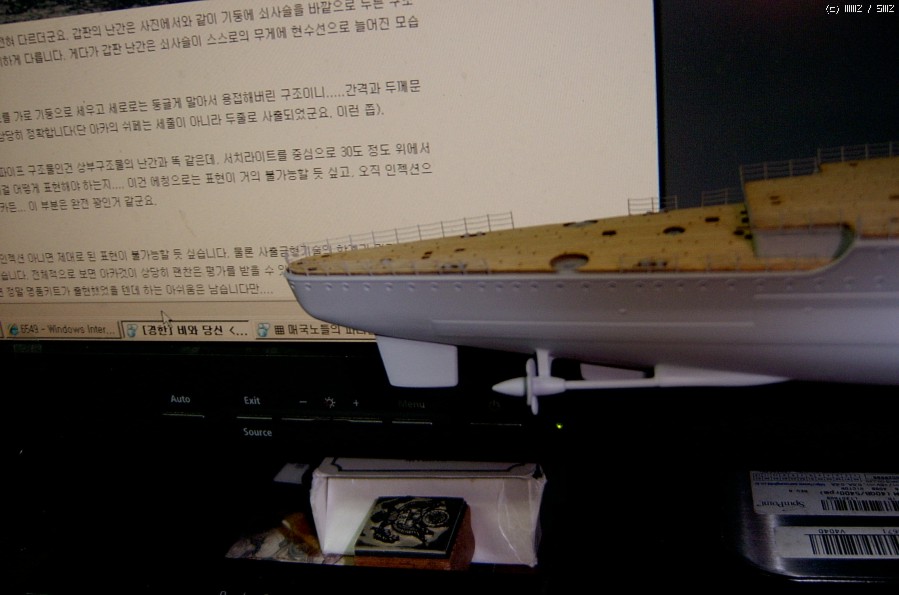 대충 목갑판을 붙이지만 않고 올린 상태에서 좀 어두운 조명으로 찍은 사진. 저렇게 보니까 모니터 밝기에 따라서는 칠 끝난 것처럼 보이더군요. (먼산) 어쨌든 목갑판을 얹고 꽉 눌러보니 아직도 목갑판이 약간 올라옵니다. 난간 붙일 때 순접이 좀 넘친 게 원인인듯. 조심스럽게 갈아내 볼까 싶습니다만, 그러기엔 이미 늦었을지도요. orz