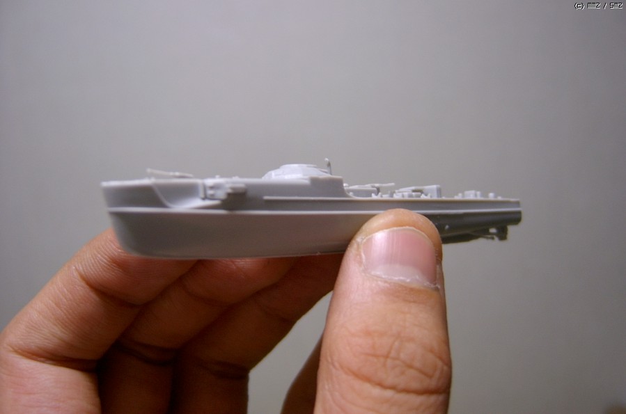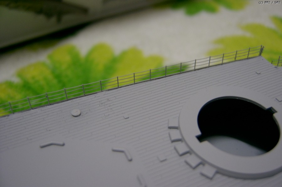 전에 함선모형란에서 썼듯 원래 헐에 있는 턱을 0.3mm 높이고 갑판과 헐 사이에 틈을 약간 벌려둔 상태인데, 목적은 난간을 미리 헐에 붙인 상태에서 색칠에 들어가려는 겁니다. 그래서 오늘 난간을 붙이고 서페이서를 입혀 뒀습니다. 이제 기본색 칠해야죠. 타미야 서페이서 라이트그레이가 어찌된 영문인지 색감이 무지 좋아서, 저 상태에서 시험삼아 목갑판 올려 보니 조명 상태에 따라선 도색완료된 것처럼 보이기도 하더군요. -_-;;;