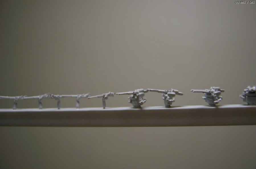 이번에는 대공화기 디테일업. 뭐 사실 디테일업이랄 건 없습니다. 그냥 다른 데에서 이식해 오는 거거든요. 전에 함선게시판에서 이야기한 것 같지만, 기본적으로는 하세가와의 대공기총+광학기재 세트에서 25mm 단장을 유용해서 20mm를 만들고, 37mm는 키트의 원래 부품에 25mm 연장/3연장의 좌석과 조준기 세트를 이식해서 좀 있어 보이게 한 정돕니다. 여기에 37mm 포신을 다른 것으로 바꿨다가 영 효과가 안 좋아서, 그냥 25mm 연장기총을 총몸째로 붙여버림으로서 대충 흉내만 내고 말았습니다. 실제 형태와는 무쟈게 다르지만, 제 형편없는 손재주로는 이게 한계네요. orz