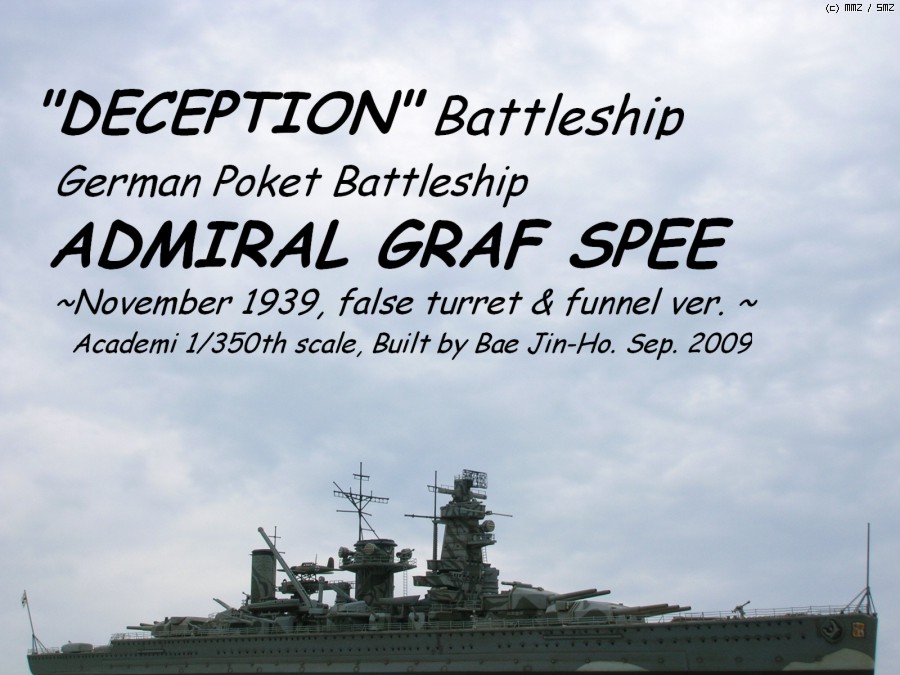 네. 이 사양은 Deception에서 짐작하셨듯 그라프 슈페의 기만전함 버전입니다. 1939년 9월, 개전과 동시에 해상에서 대영 적대행동에 나선 그라프 슈페는 동년 12월 몬테비데오에서 자침시까지 해상에서 수많은 영국 수상함대의 추격을 받았는데 자침으로부터 약 한달 전인 1939년 11월, 인도양에서 남대서양으로 넘어오던 시기 영국 순양함의 추격을 뿌리치고자 상부구조물 전방에 위장(false) 포탑과 위장 연돌까지 달고 활동할 때의 사양입니다.