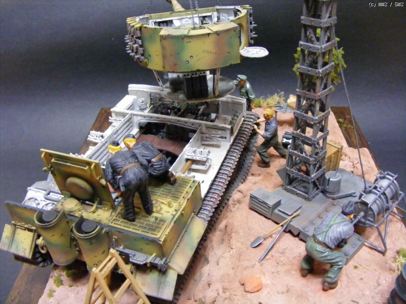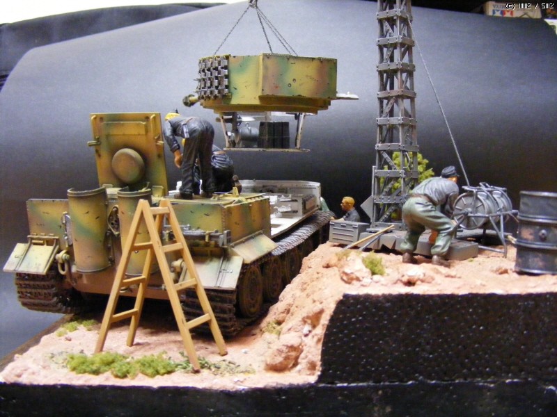 독일 6호전차 "타이거"가 동부전선 쿠르스크전에 참가한 후 격전을 치르고 잠시 후퇴하여 현지에 마련된 정비소에서 재수리하는 상황입니다. 전차 승무원들은 엔진을 점검하고 전차 수리병들은 포탑을 분해하고 파손된 캐터필러를 새로 교체하는 모습입니다. 기록에 보면 타이거의 캐터필러는 수송용에서 전투용으로 현지에서 바로 교체하였다고 되어 있으며 이 작업은 상당히 고된 작업이었다고 기록되어 있습니다.