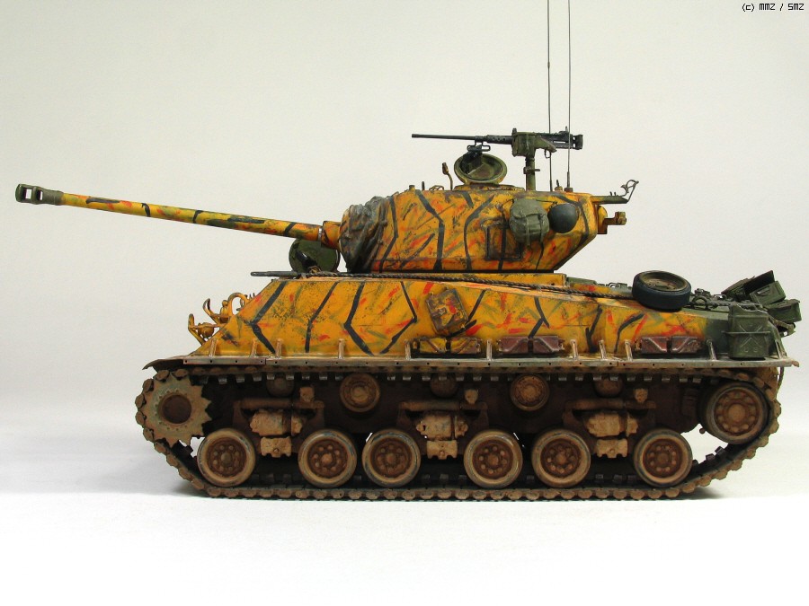 타미야 박스로도 유명한 문양인데 소속은 미 제 5보병연대 전차중대 같습니다. 차체 전면 아가리 밑에 작은 빨간 5각형이 연대 마크입니다. TK-41은 임의로 붙인 데칼 짜집기로 실차사진(45번)을 살짝 빗겨간 꼼수로 동시에 타이거 위장 범위도 도면보다 임의로 넓혔습니다.