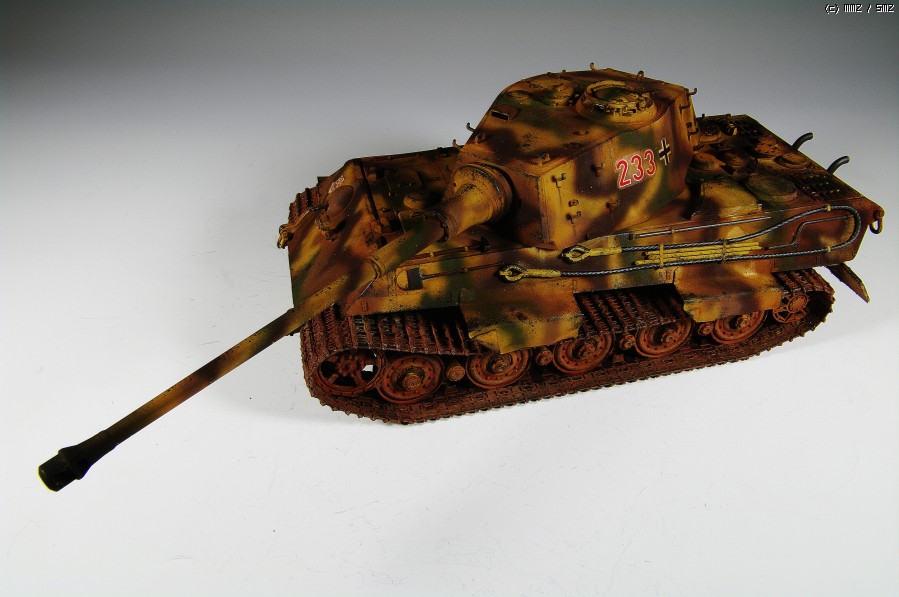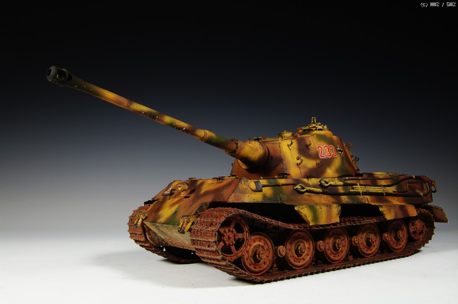 타이먀 킹타이거 포르쉐 타입입니다. 측면의 장갑판은 황동으로 된것을 몇개 얻은 것이 있어서 붙여 주었고, 트랙은 동사의 별매트랙을 사용했으며, 기타 추가품은 없습니다. 험브롤로 3색 위장을 시도했는데, 고증에 따른 것이 아니라, 그냥, 프리핸즈로 했습니다. 트랙에는 뭔가 붉은 끼를 돌게 하려고 이지머드 적용후, 테이스터스 RUST를 물게 희색해 발라 주었습니다. 결과가 신통치 않아 더 발라줄까 하다가 그쯤에서 마무리 했습니다. 전작인 팬저3대보다 먼저 완성했지만 지금에사 올립니다.
