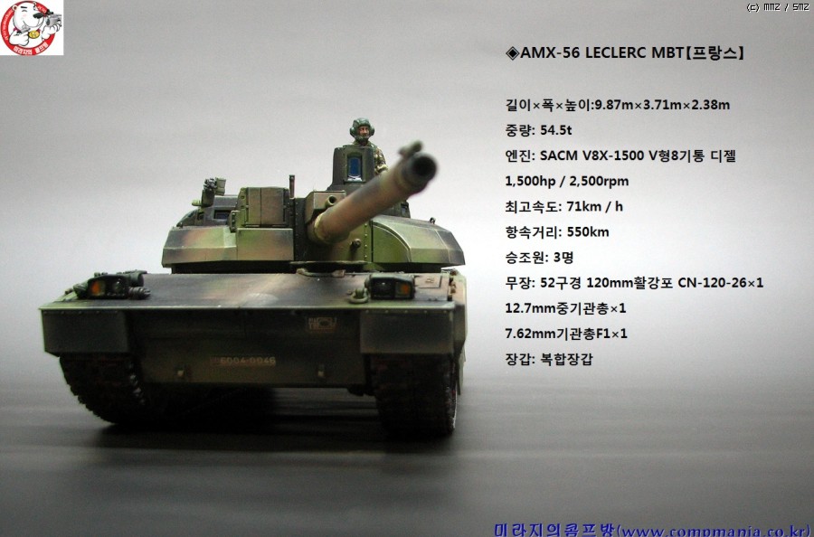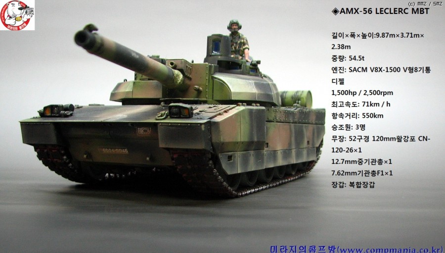 AMX-56 르클레르 전차는 흔히 4세대 전차의 기원을 연 전차로 항공기에 사용되는 에비오닉스 개념을 전차에 첫 도입한 전차로 프랑스의 전차 제작기술이 총 동원된 최신 전차 입니다. 다만 수출은 오만외에 별다르게 성공을 하지 못하고 있습니다. 냉전시대와는 달리 이제는 어느나라던 마음만 먹으면 성능좋고 (가격도 쎈) 독일제나 미국제 전차들을 구입할수 있으니까요.. 그래도 독일제나 미국제 전차와는 다른 독특한 라인이 잘 살아있는 전차라 생각됩니다.]
