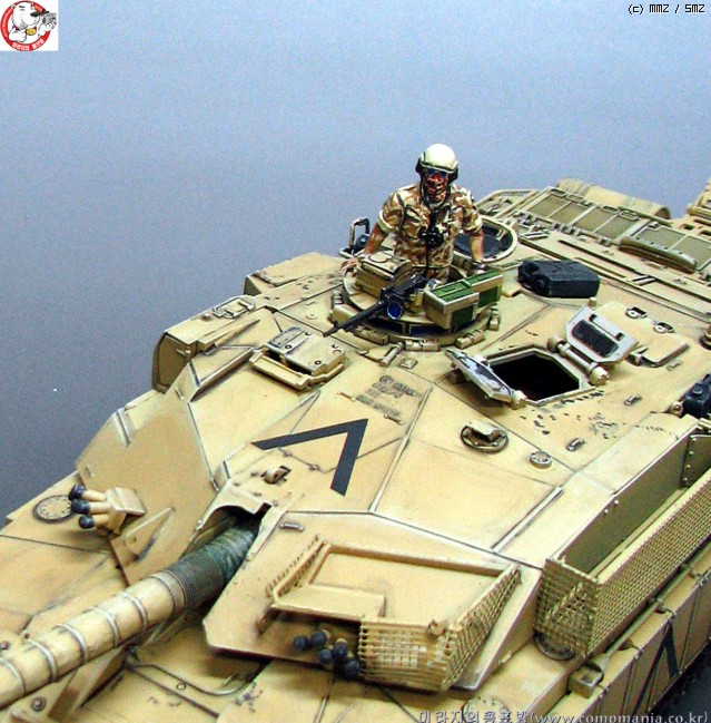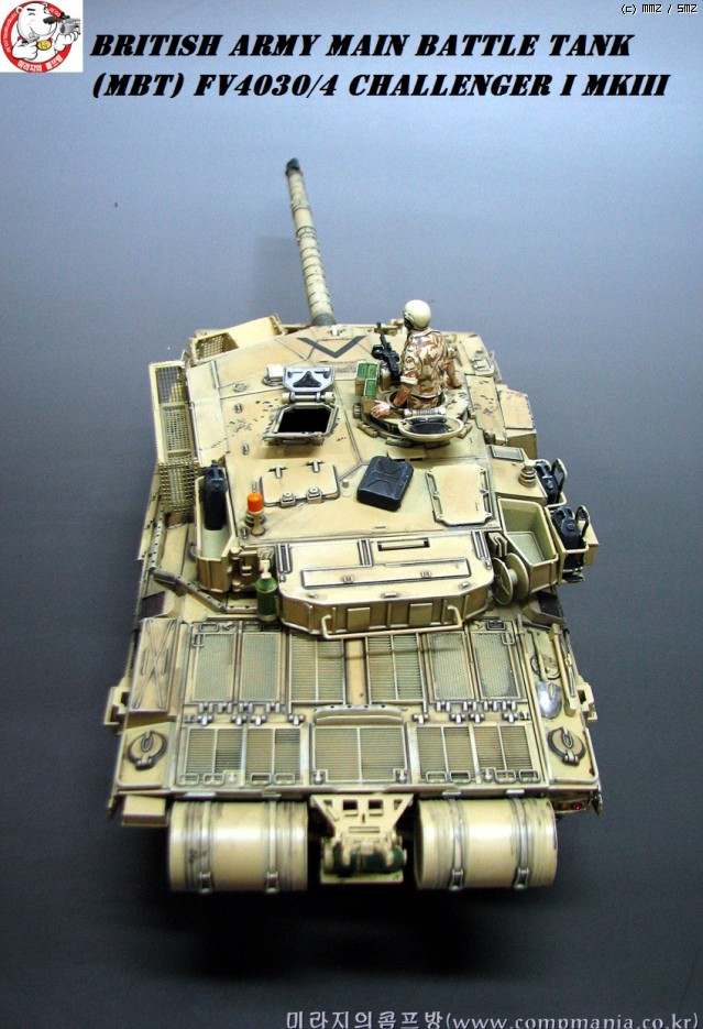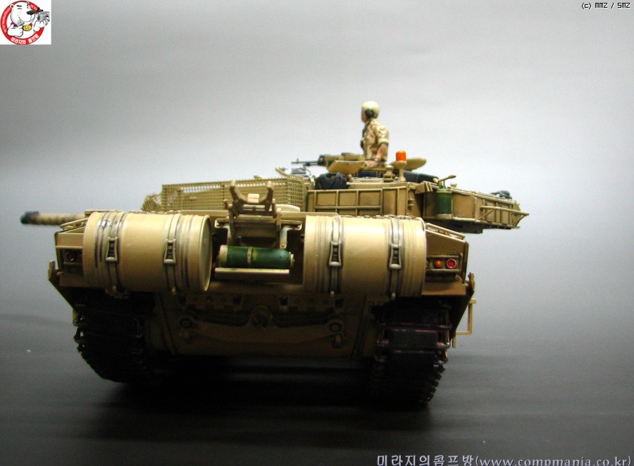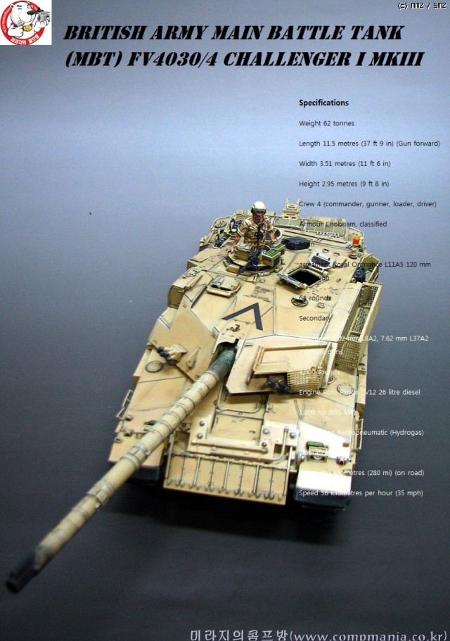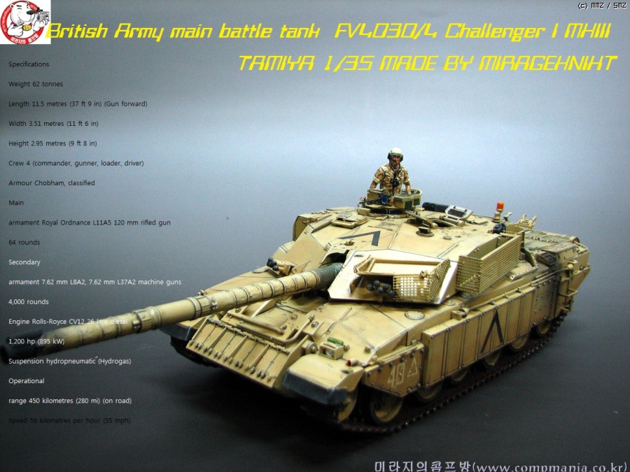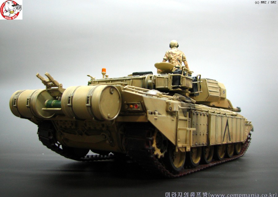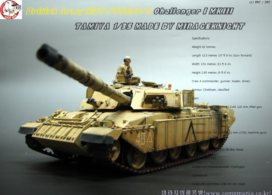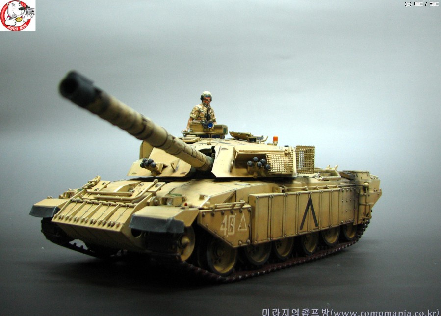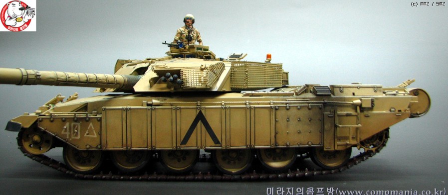 타미야의 제품들이 그렇치만 스트레이트로 제작해도 기본적으로 어느정도 품질이 받처주는 제품 입니다. 저같은 곰손이 만들어도 이처럼 뽀대가 살아납니다. 제품은 걸프전에 참전한 챌린저 전차의 개량형타입인 mk3 입니다. 걸프전에서 무려 5100미터에서 이라크군의 전차를 명중시켜 격파한걸로 유명합니다. 디스커버리 채널에서 방영중인 top10 에서도 한번 다룬적이 있었죠