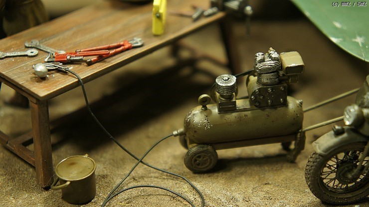 디오라마의 내용은 상태 좋은 제로기를 미군이 입수해 야전 비행장에서 정비하는 디오라마 입니다. 베이스는 기본적으로 타미야 텍스쳐를 이용해 만들었으며 철조망은 이쑤시개와 얇은 철사를 이용해 자작했습니다. 갈대와 풀은 기존에 나와있는 제품에 도색을 해서 심어주었습니다.