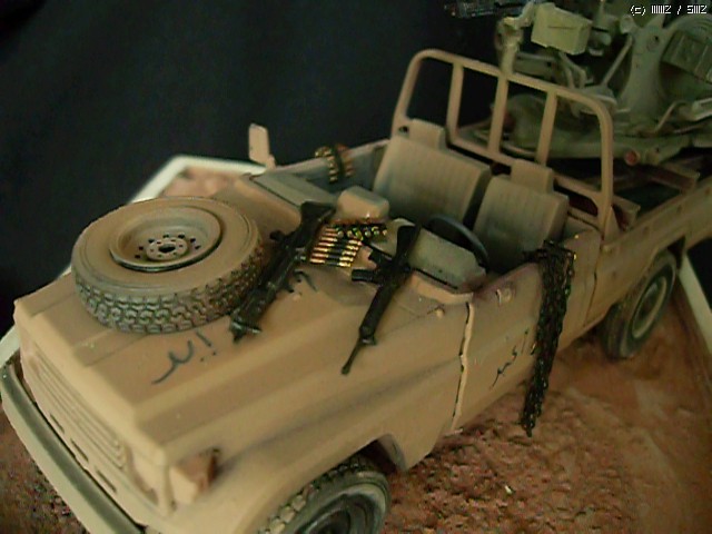 안녕하세요. MENG model의 픽업트럭입니다. 마감제 뿌리기 귀찮아서 묵히다가 오늘에야 뿌렸습니다. 이번에도 베이스를 만들었는데 요즘 베이스 없이는 허전해서 못만들겠어요 ㅋㅋ.. 원래 픽업트럭은 지붕이 잇는데 실차사진을 보니 지붕이 날라간게 있어서 그것을 모티브해서 만들었습니다. 차량에는 الله أكبر와 17فبراير라고 써있는데 이것은 '알라는 위대하다' (저 무교에요. 알라신 믿는다고 오해없으시길)와 '2월 17일'이라는 뜻입니다.(2월17일은 카다피 정권이 무너지고 리비아가 민주화된날)