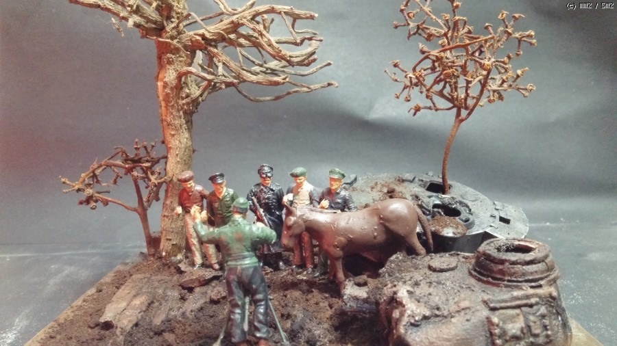 전차대가리는 그냥 망친놈들 잡아다가 배치해보았고 흙은 커피가루를 뿌린뒤 목공용 풀과 물을섞어 분무기로 분사해주었습니다 목공풀을 너무많이 풀으면 분사가안되므로 멀겋게 섞어줍니다.