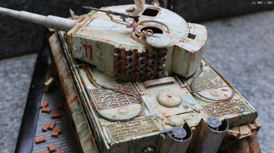 다크 옐로 기본 도색에 다크그린, 레드브라운 등으로 위장을 해주고 그 위에 거친 붓으로 흰색 에나멜을 칠해 줬습니다. 일부러 벗겨진 것을 표현하기 위해 옅게 칠해줬고 그 과정에서 블렌딩 효과도 얻었습니다.