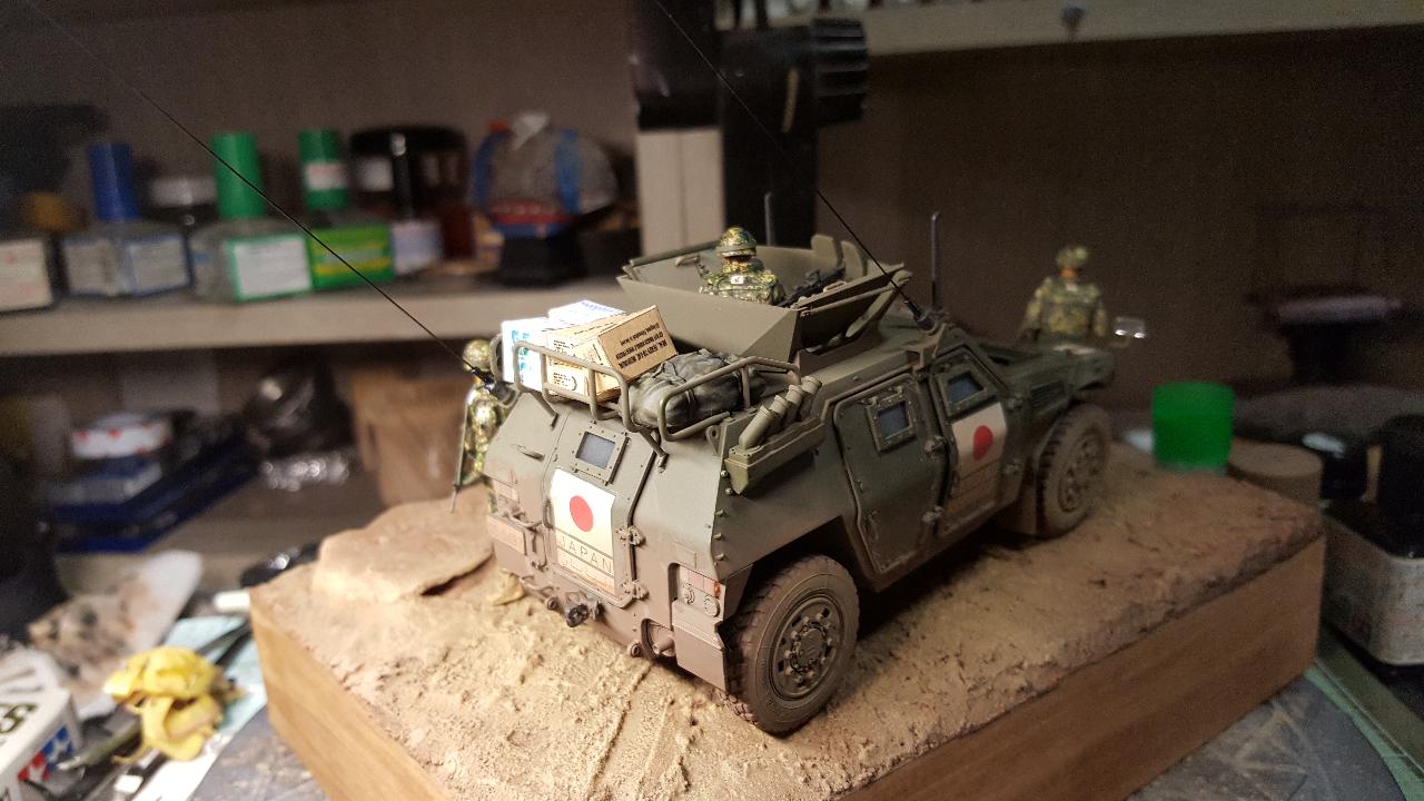 너무 민밋 해서 높이에 변화를 줬고. 허드슨앤알랜의 락 몰드를 이용 바위를 심었고 아무리 사막이지만 잡초와. 에칭 보리인지. 갈대인지 두개를 심었습니다. 위장복은 신선조 데칼을 사용 했고. 철사로 된 별매 안테나와 은박 스티커로 사이드 미러의 디테일 업을 했습니다.