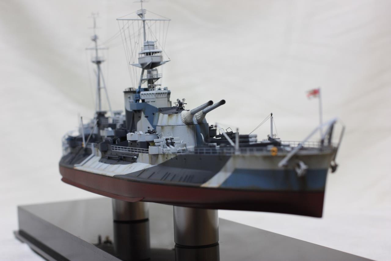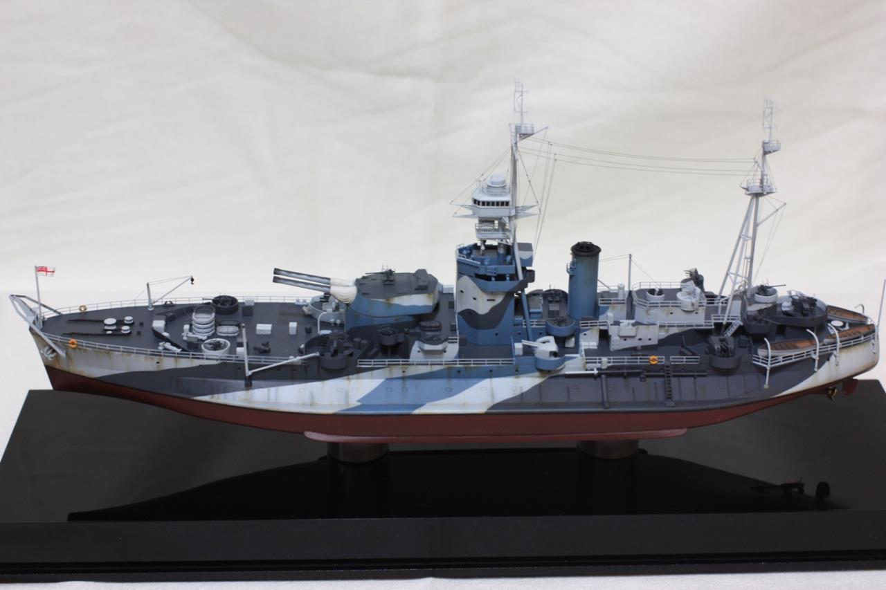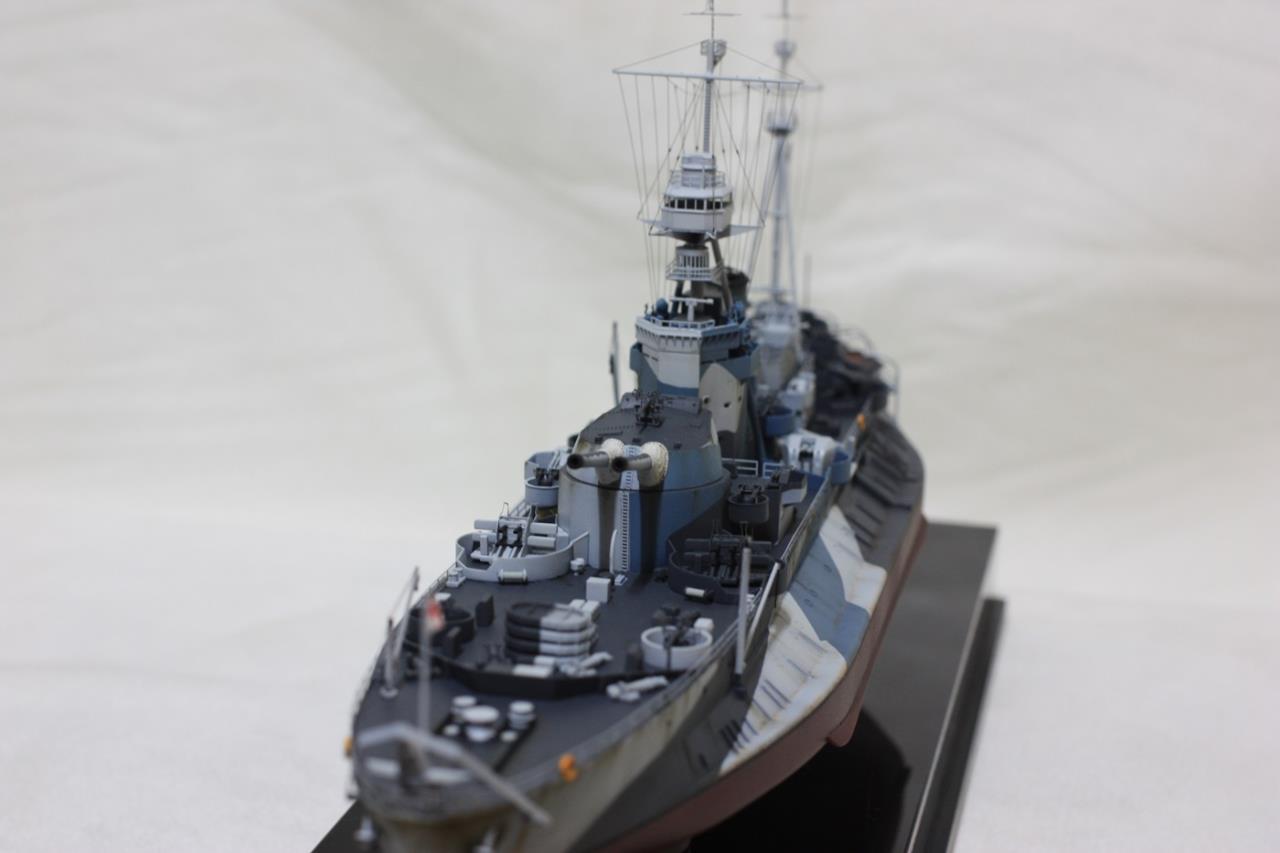 주포 각도를 바꾸기 위해 방수포를 에폭시 퍼티로 자작. 키트의 레이더에칭을 날려먹는 바람에 별매에칭 구입(키트의 레이더 모양이 틀려먹어서 새로 사는게 좋습니다. 아니 그냥 별매에칭 풀셋을 사심이..) 크래인 개조 (반 가까이 자작-이거도 별매에칭셋 사면 해결됨) 금속제 리깅선 으로 리깅, 로우엄버 유화도료로 녹슨 표현 등을 해주었습니다. 위장도색의 경우 일부 키트의 도색설명서를 무시한 부분이 있습니다. 도색설명서에는 홀수선 라인 위쪽으로도 헐레드를 칠하라고 되어 있는데 그러면 너무 촌스러워 보이는지라 실물사진 확인 안하고(못하고) 바꿔 버렸는데 보기 좋으니 넘어갑시다. 그거말고도 위상색 라인이 하나 틀린게 있고...