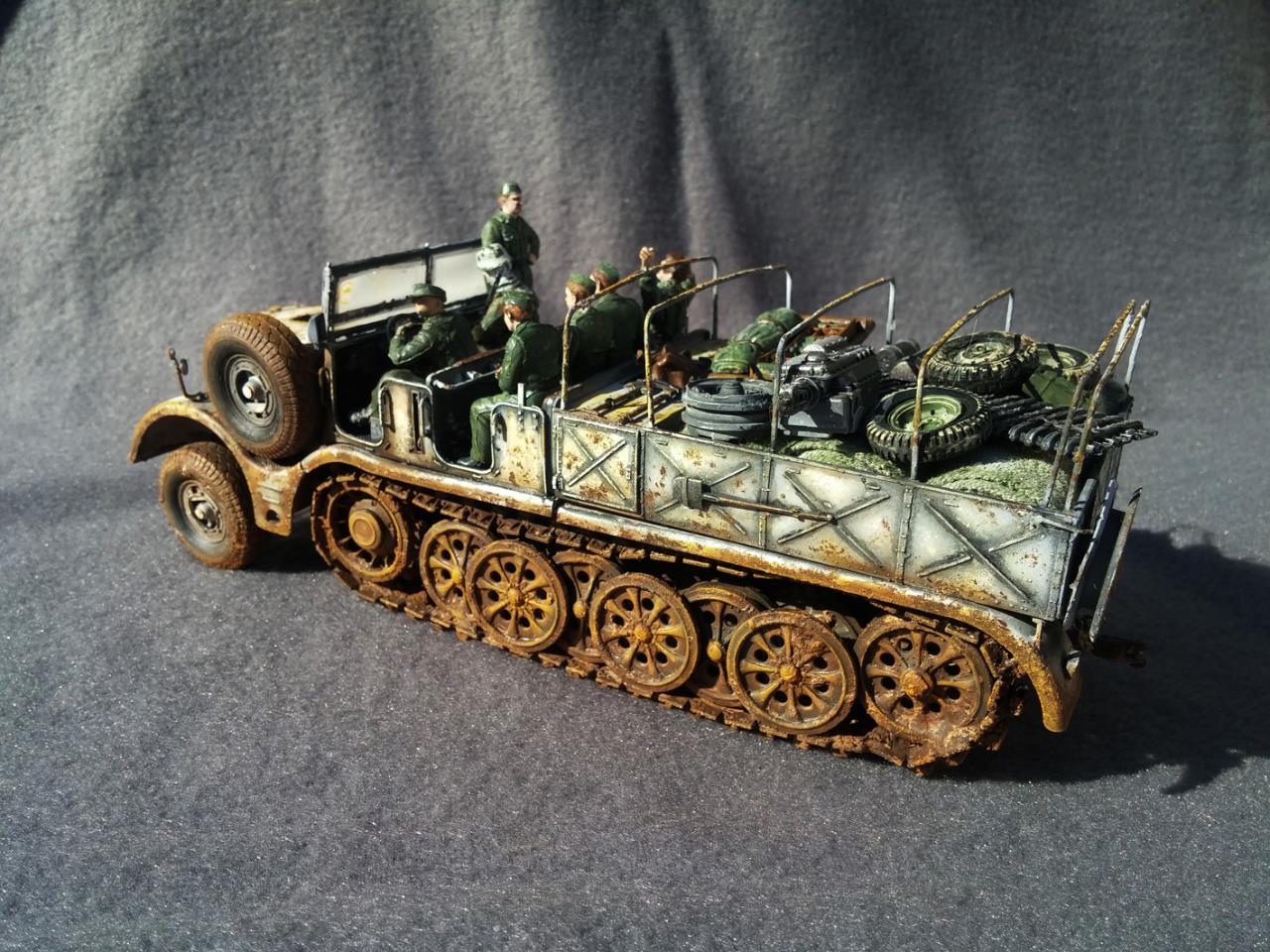 궤도는 블랙을 칠한뒤 조금의 식소다+목공풀+타미야 레드브라운을 많이섞어준뒤 궤도에 묻혀주고 드문드문바퀴에도 묻혀준뒤 다마른뒤 레드브라운색을 에어브러쉬해줬습니다마르면 색상이 허옅게 뜨기때문입니다.그리고 <타미야 웨더링셋>을이용하여 색상을조절했습니다 없다면 파스텔가루등으로 색감을 주면됩니다.